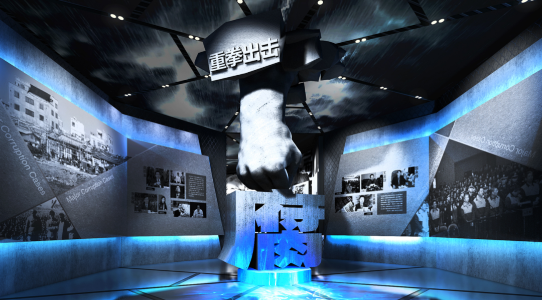主题雕塑、异形墙体、用压迫式的感受全方位、大篇幅展现安徽省乃至全国各大落马的情况,使观众受到强烈震撼;天空用破碎的屏幕中电闪雷鸣,营造反腐风暴的风云激荡;地面利用动感地投打出冰面,当人走上去,脚下会出现裂纹,耳边也会传来冰面开裂的声音,使观众切身体会到“如履薄冰”的感受;