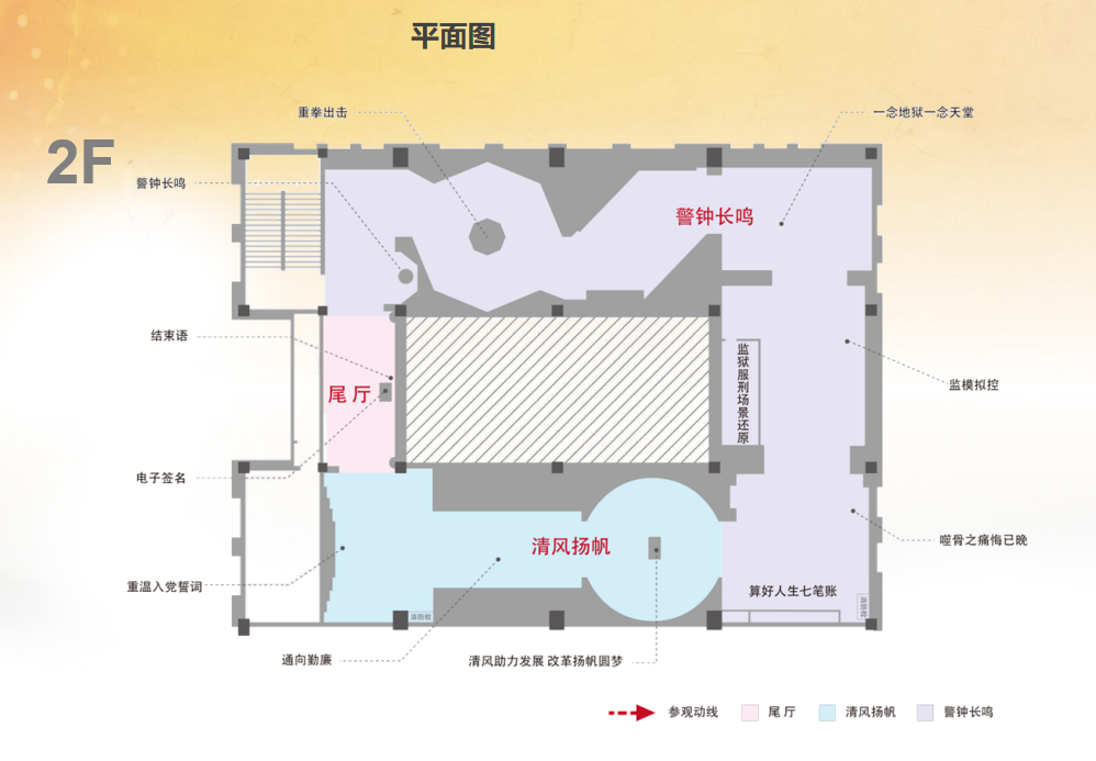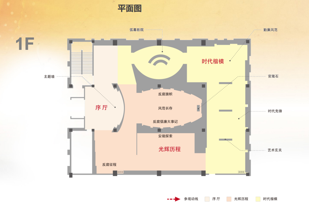 安徽省廉政教育基地总面积约1300平方米,分上下2层,单层挑高约3,5米;