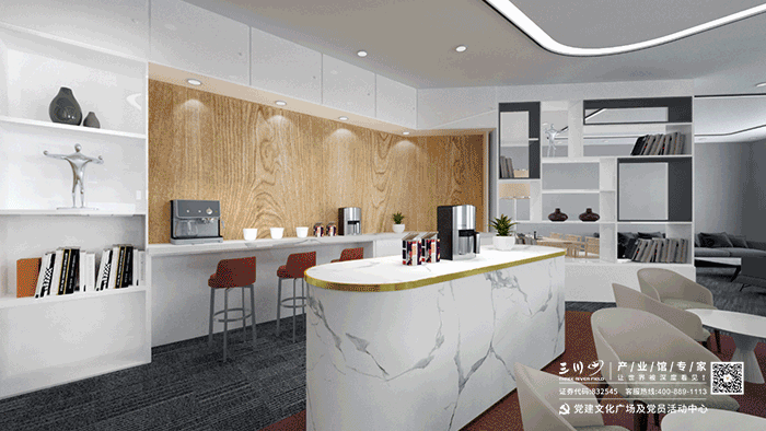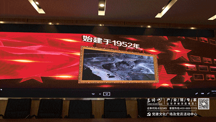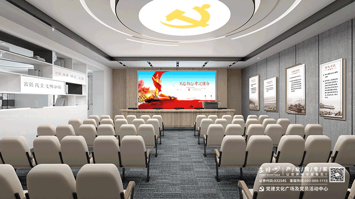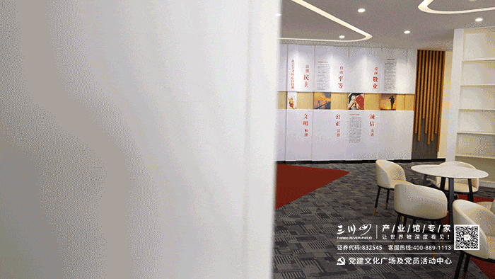 大堂讲区与会议区 是宣传党的精神发展阵地,三川田 通过适度的形象展示与影片内容,营造出浓厚的党建学习文化氛围。