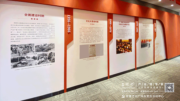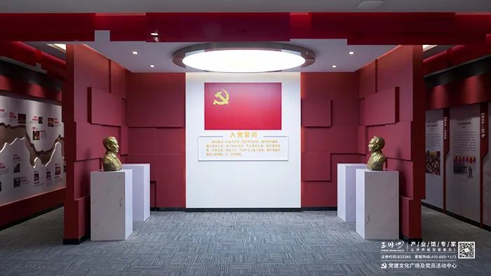 全馆选取最具有传统文化象征的 “中国红” 作为主色调,搭配白、金两色进行合理设计,形成党建文化建设中主次分明、多元统一的色彩系统,整体打造庄严、肃穆的氛围。