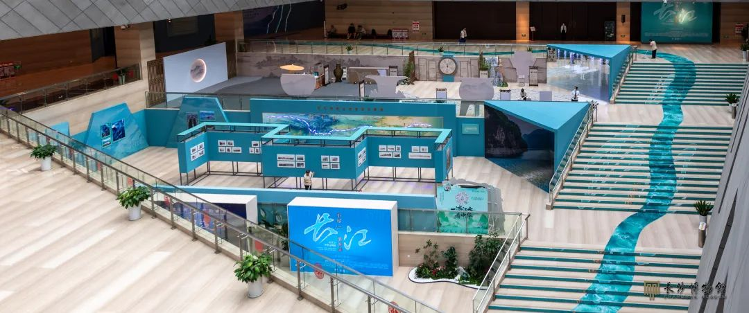 展览在展陈设计方面大胆创新,深度融合长沙博物馆展厅内外建筑空间,巨大穹顶的中庭作为大序厅,三级台阶布置成展览的伏笔,通过教育活动、互动体验、数字展示等形式,营造长江自然地理与文明传承的意境体系,为理解欣赏展品提供良好视角和切入点。观众进入博物馆即可 “溯流”而上 ,感受长江流域文明演进,览阅万里江河文化盛景。
