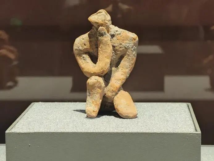 “妈妈快看,这是思想者”,一位正在二层展厅参观的小观众兴奋地喊道。这件出土于石家河遗址的陶塑高约7.5厘米,造型独特,陶人右腿支起,右手托着下颌,神态沉思,与法国雕塑家罗丹的作品《思想者》有异曲同工之妙,因此也被观众们称为“东方思想者”。