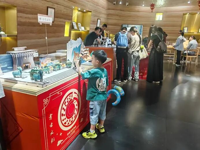 文创店内,暖黄的灯光流淌在琳琅满目的文创产品上,瞬间勾住了小朋友们的目光。他们双手捧着考古挖掘盲盒,指尖轻轻摩挲着包装盒上的纹路,仿佛已化身为穿越时空的小小考古学家,正屏息凝神地想象着亲手从黄土中发掘出 “文物”时的惊喜场景。打卡盖章处更是一片热闹景象,孩子们紧紧攥着泛着墨香的“考古日记”,用一双双小手小心翼翼地按下一枚枚印章。随着精美的文物轮廓跃然纸上,孩子们的脸上露出了灿烂的笑容。