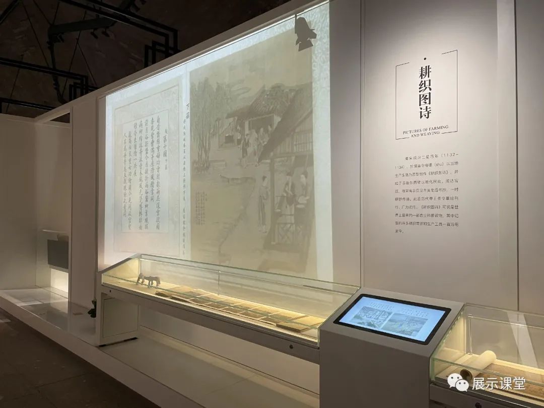 而时任南宋於潜县令绘制的《耕织图诗》运用 投影的方式呈现 ,置于《於潜女》对面,与之遥相呼应。