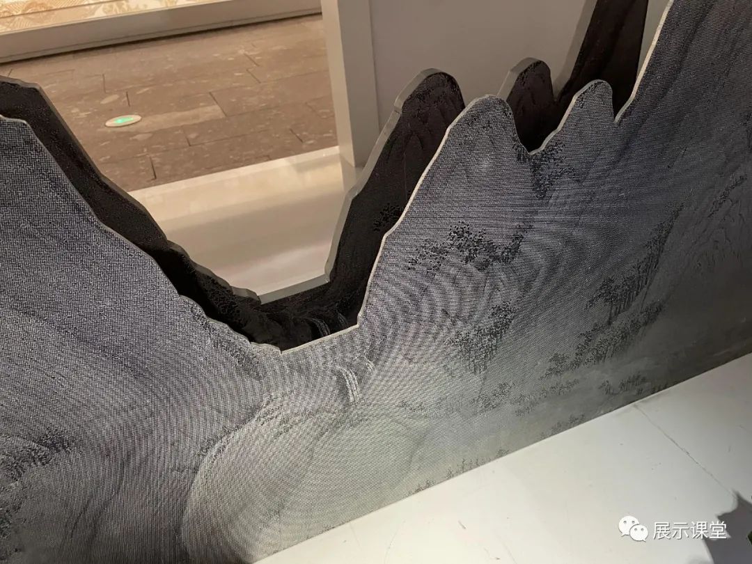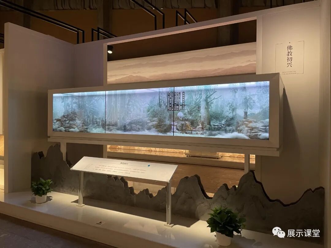 佛教初兴展项运用 透明屏,参观者通过触摸屏幕即可查询相关内容。底部连绵山峦造型使用铝板UV雕刻,前后叠加,远处观看,隐约 形成立体的山脉。