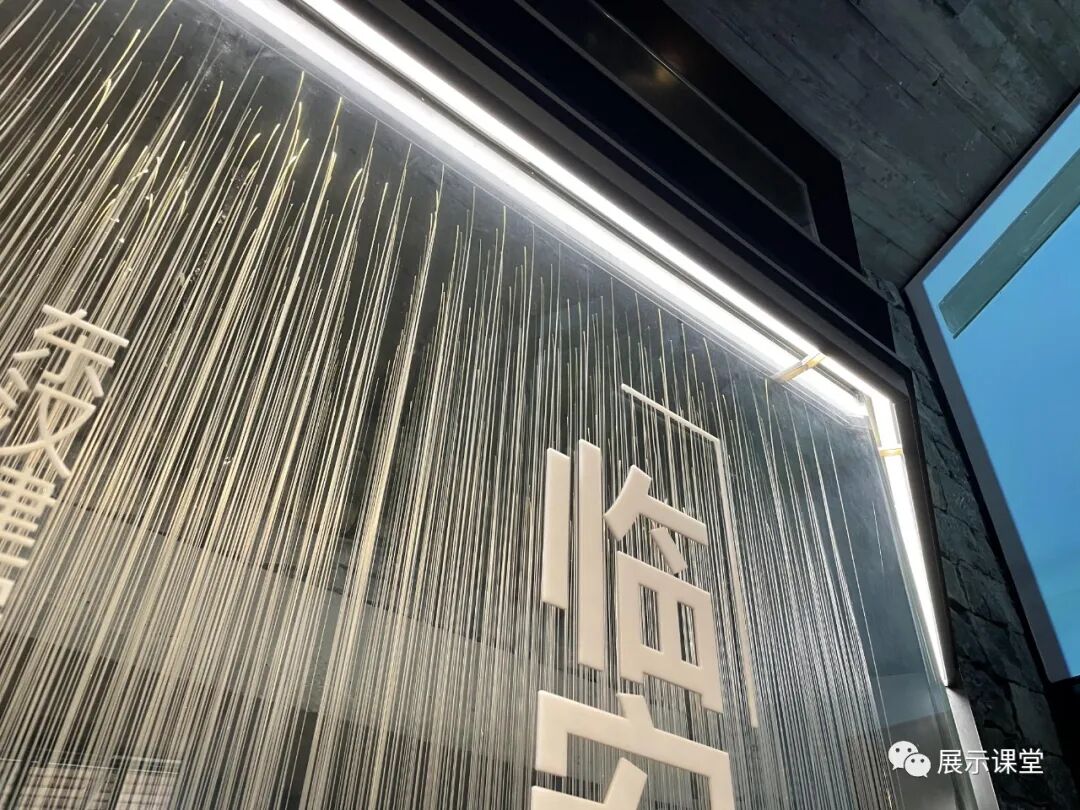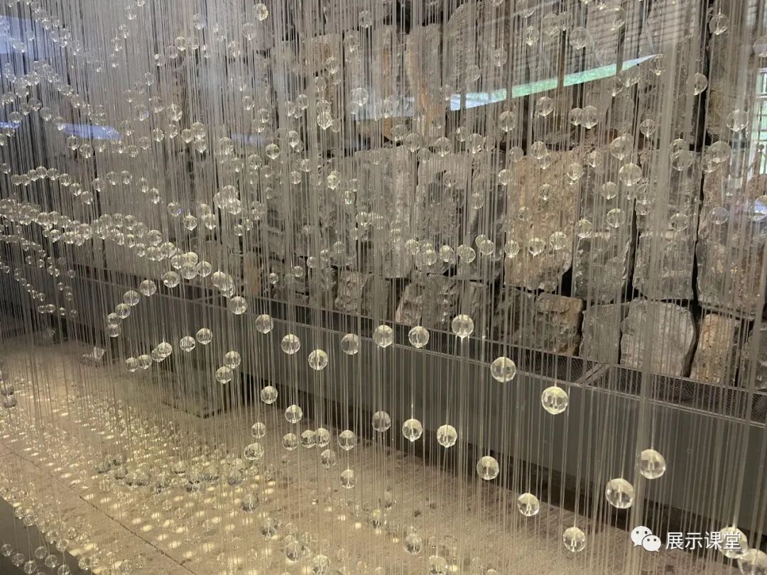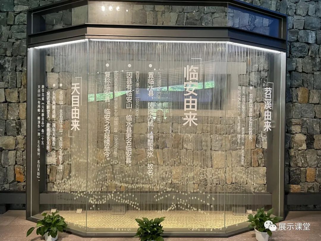 主题墙左侧设置 艺术装置,介绍苕溪、临安、天目山由来。光纤灯与水晶球高低错位排列,组合成一幅连绵起伏的天目山峰峦意境图。