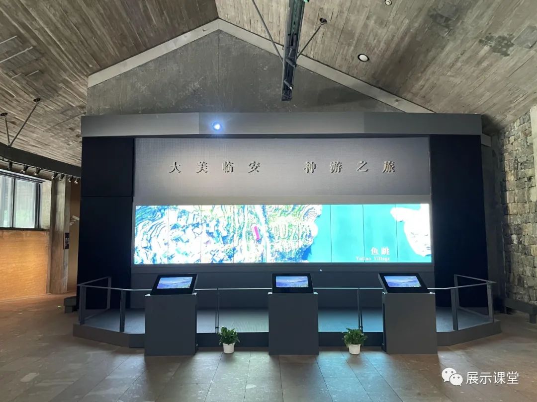 步入序厅,可见大美临安神游之旅展项,触摸屏与墙面拼接屏 双屏互动 ,查询临安美景。