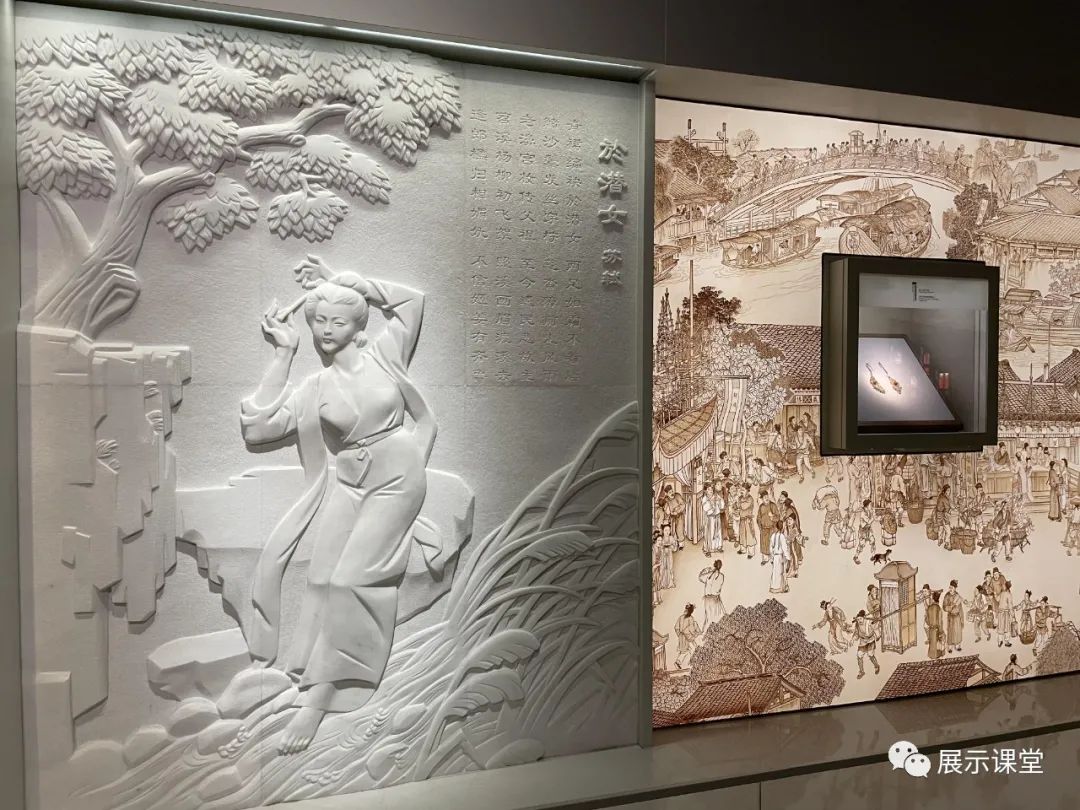 一件《於潜女》白色 石材浮雕引人注目。这一幕,将苏轼诗中於潜女的形象具化,让人联想到千百年前“青裙缟袂於潜女,两足如霜不穿屦”的画面。