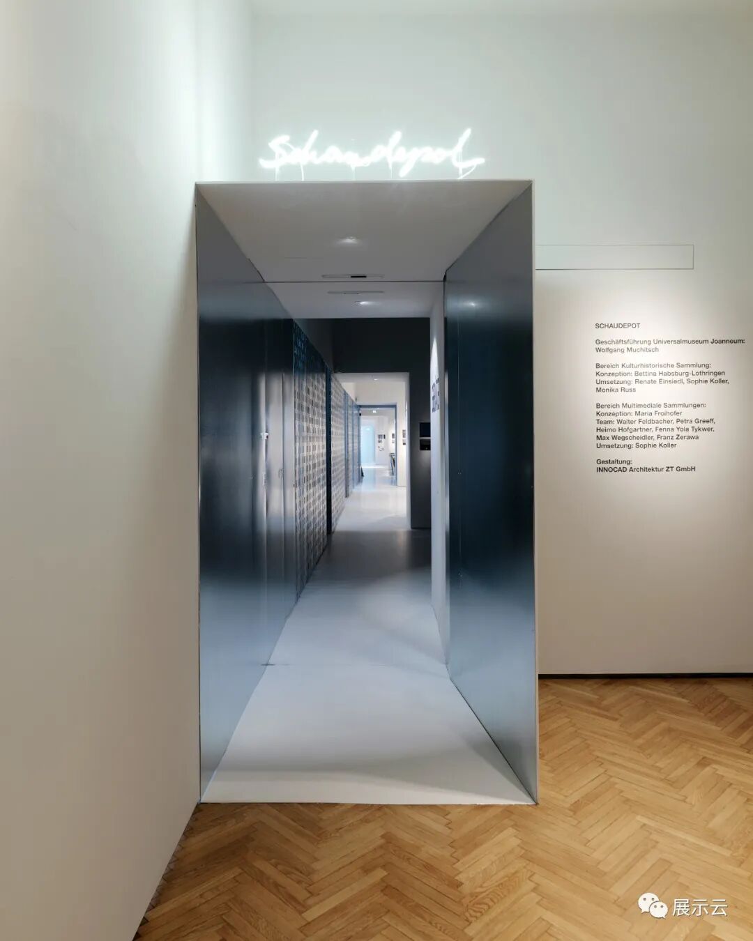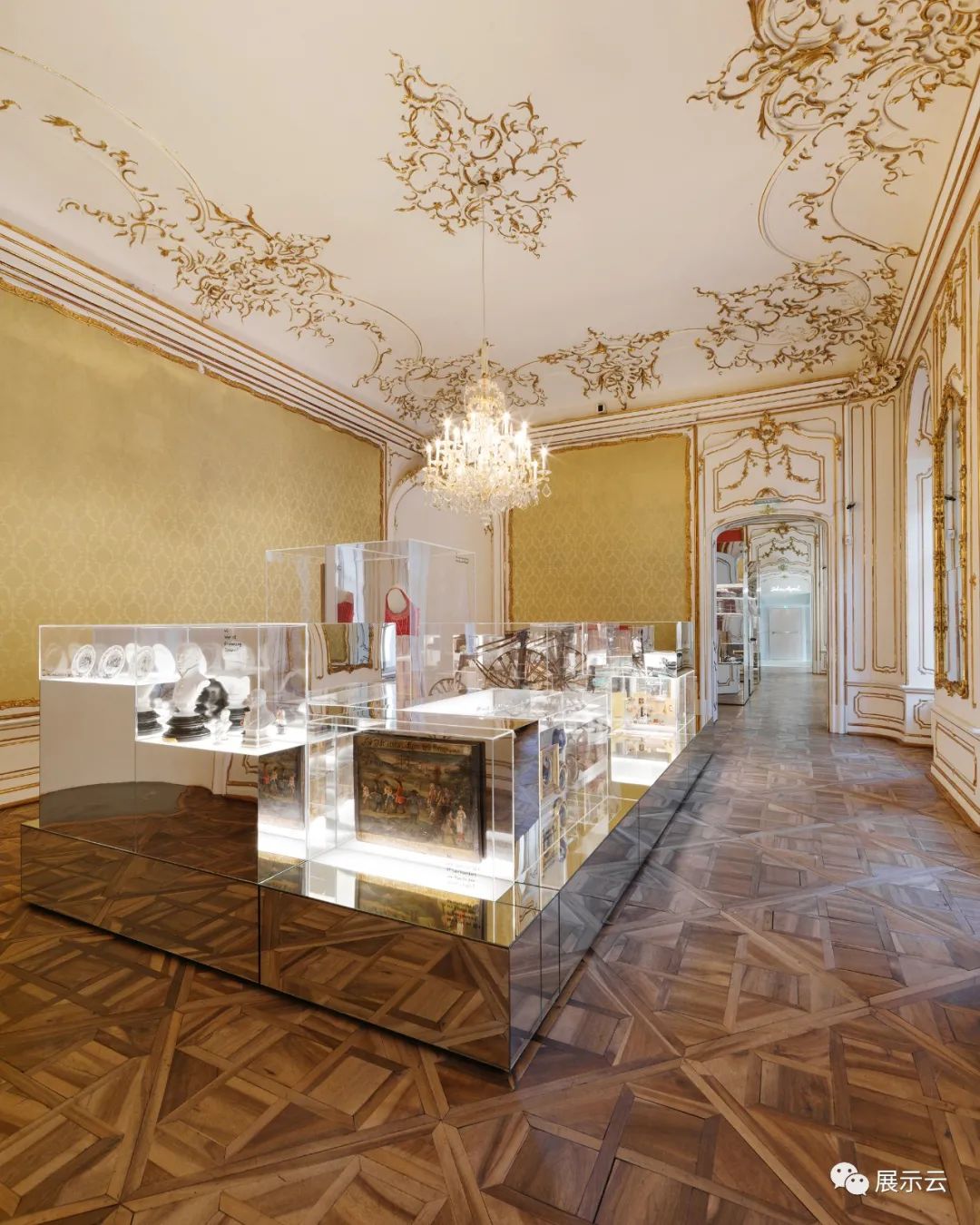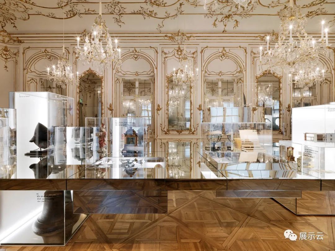 100 x Steiermark展区位于一间布满镜面的历史房间内。该空间的功能布置和艺术设计都异常清晰和考究。为迎合“历史的安放”主题,由玻璃和镜面组成的展示台散布在展区内,时刻提醒着并回应着这些历史文物的辉煌过去。空间、展品、展示装置相互融合,模糊了各展区之间的界限,带给来访者一个连续的空间体验,并引领人们思考过去和展望未来。