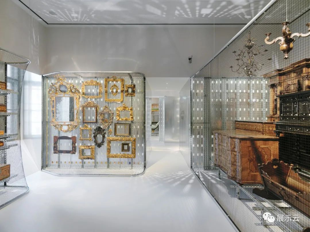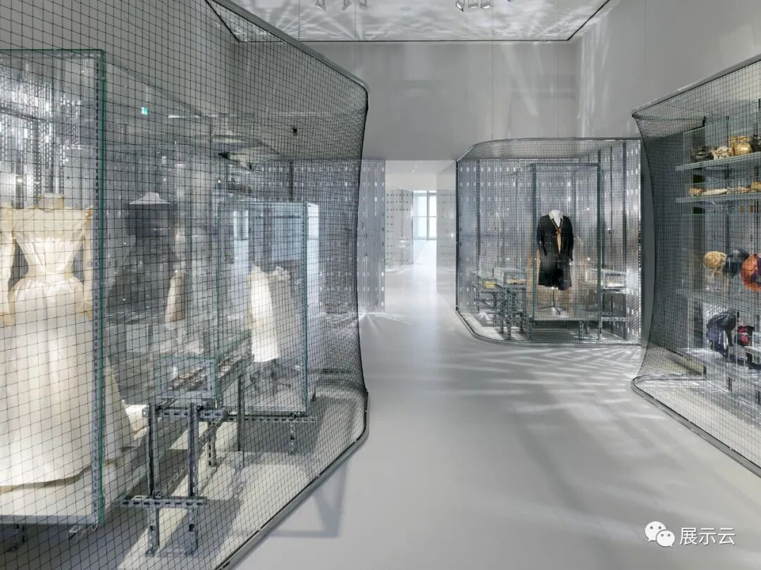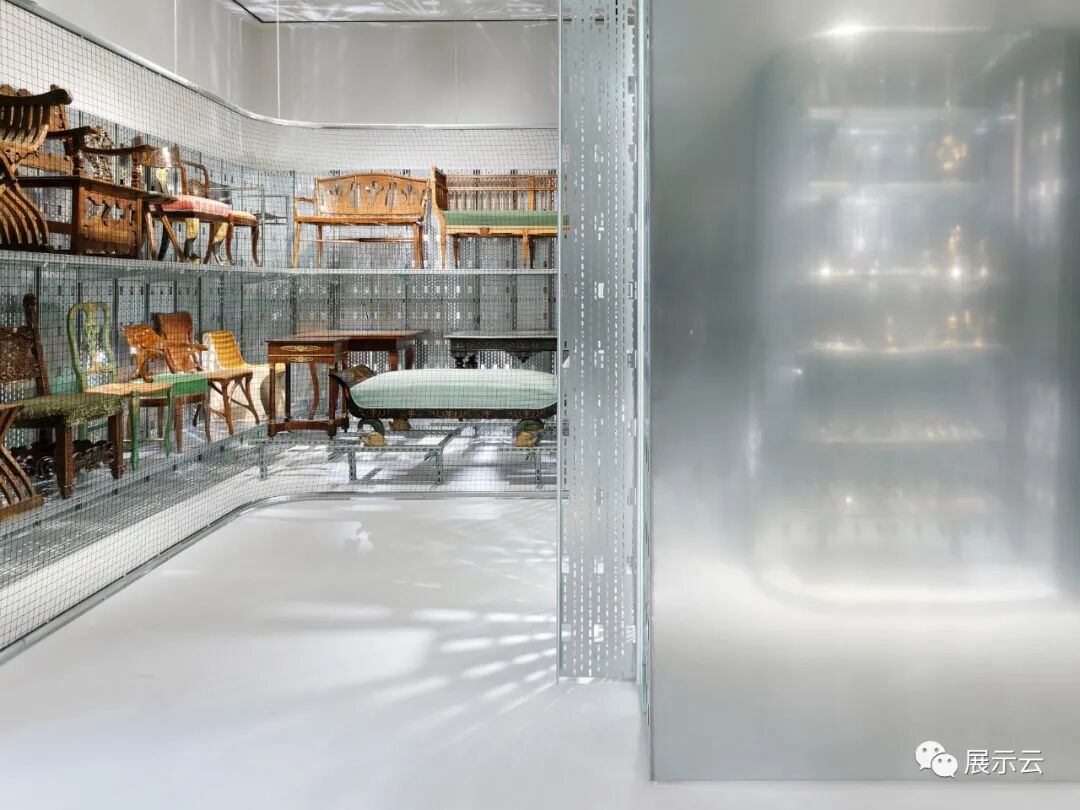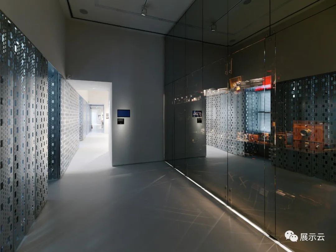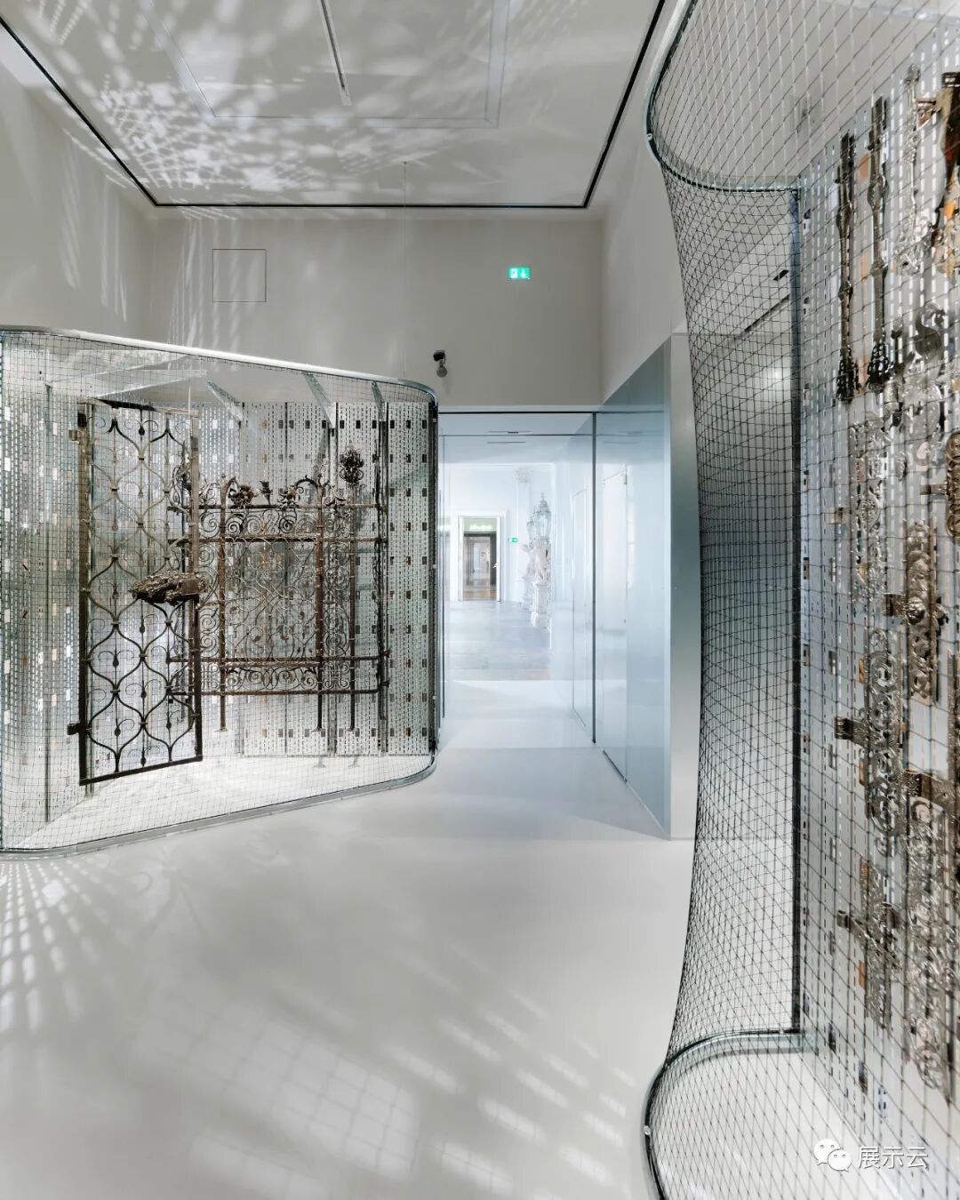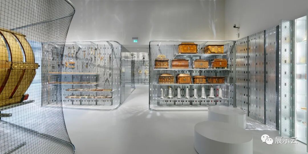 在观展流线的最后, 所有隐藏的珍宝都将呈现在来访者的面前。一个由金属网编织而成,充满工业化氛围的无限循环过渡空间,将古往今来的历史遗存与当代设计完美结合