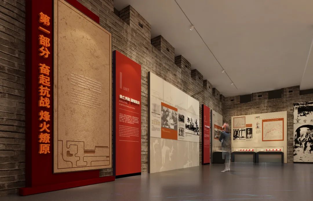 进入第一部分奋起抗战烽火燎原,营造长城城墙效果并结合版式、实物来展示国共合作、团结抗日、巩固平西、坚持冀东、发展北平等内容。