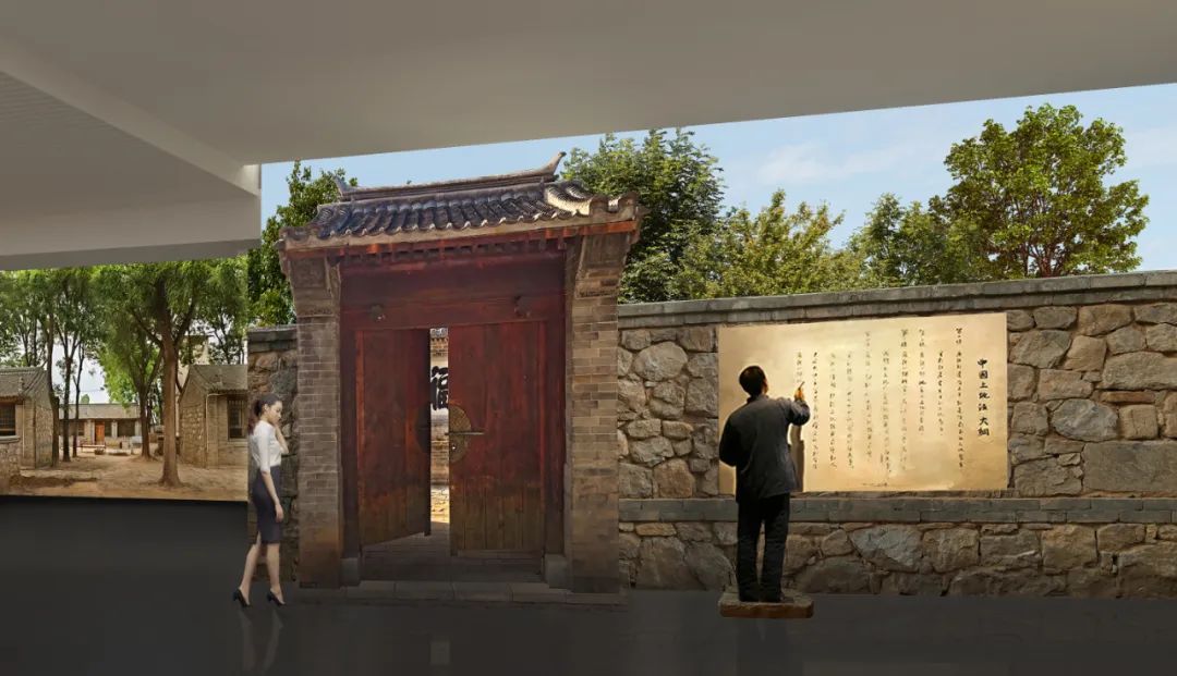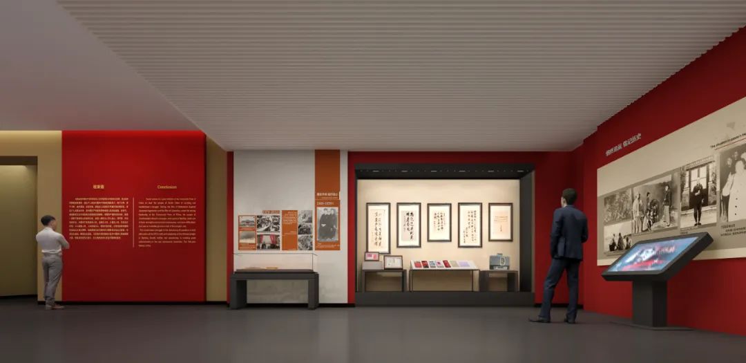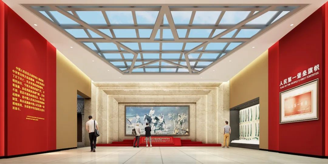 进入序厅首先映入眼帘的为厚重的体块结合浮雕造型,浮雕重点展示团结抗日、军民团结支前、军民维修改造地道并运用于战争、迎接胜利等内容。右侧立体为毛泽东《论持久战》、左侧为前言、中间结合主题字来点明展览主题,整体色调为暖色系来突出焦庄户人民战争不可磨灭的光辉印记。