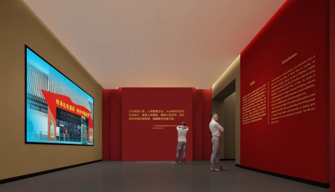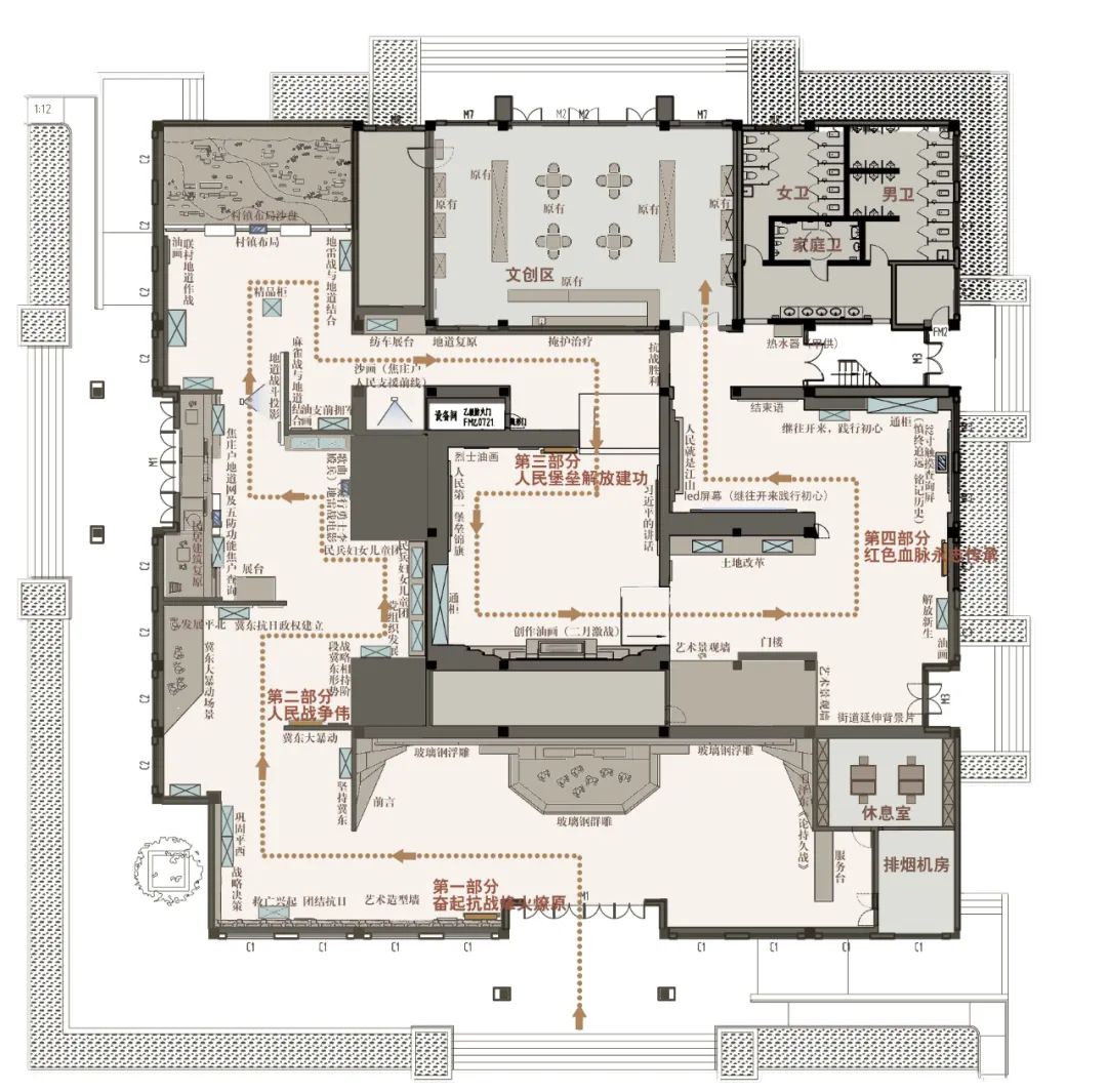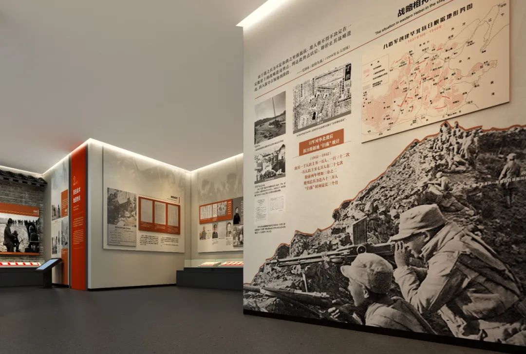 人民伟力胜利之本——焦庄户地道战革命历史陈列共分为四个部分,分别为第一部分:奋起抗战烽火燎原,第二部分:人民战争伟大创举,第三部分:人民堡垒解放建功,第四部分:红色血脉永志传承。我们通过整合、创意、建构三次元的陈列设计语言,构筑一个稳重,得体,极具艺术感染力、使观众融入焦庄户地道战特定的展陈空间,为体现陈展空间中的亮点,在表现形式上以写实与写意交融的创作手法升华陈列内容。从外入内,由远及近层层递进的诠释人民第一堡垒的精神内涵。整个展览沿顺时针参观,无逆行不交叉,方便观众参观展览。