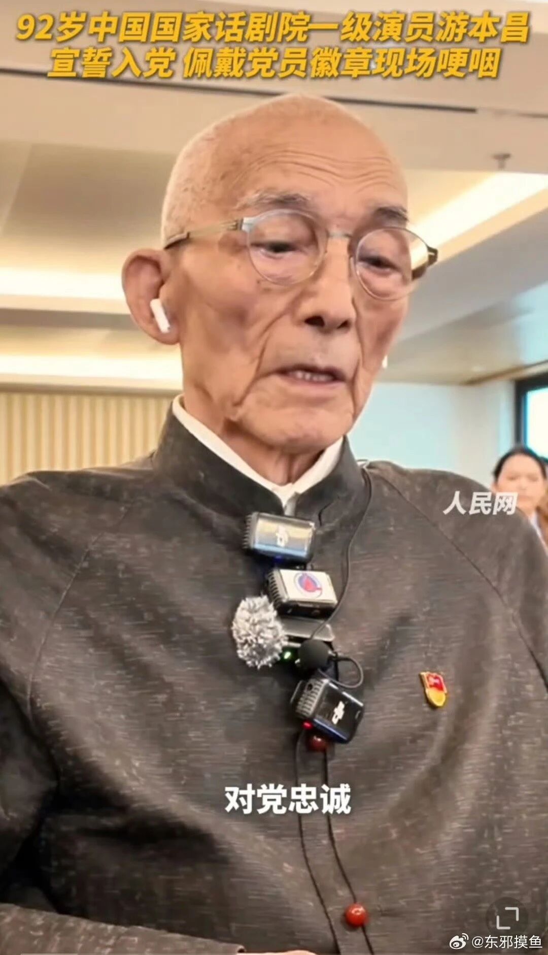 “对党忠诚,积极工作,为共产主义奋斗终身,随时准备为党和人民牺牲一切,永不叛党。宣誓人,游本昌!”92岁的游本昌宣誓加入中国共产党,佩戴党员徽章一度哽咽,他说,这一辈子中间产生过入党的愿望,但是始终藏在自己心里,觉得不够,还差得很远。“到了今天,我自己也要成为其中的一员了。这种感动、激动,从没有过。”