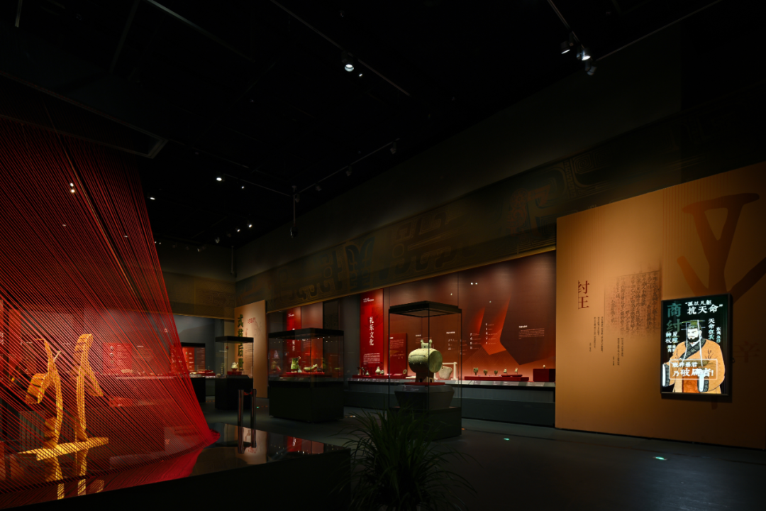 为了充分体现商王朝的体国经野之道,展陈设计创造了 “维度织体”的视觉语言,贯穿整个展厅组合序列的红色丝线形成视觉引导,将展陈内容组织其中,展墙版面通过视觉符号强化突出 青铜礼器的威严与甲骨占卜的神性 ;再经由 无数的经纬线,将商朝塑造成经济、军事与信仰的聚合体。