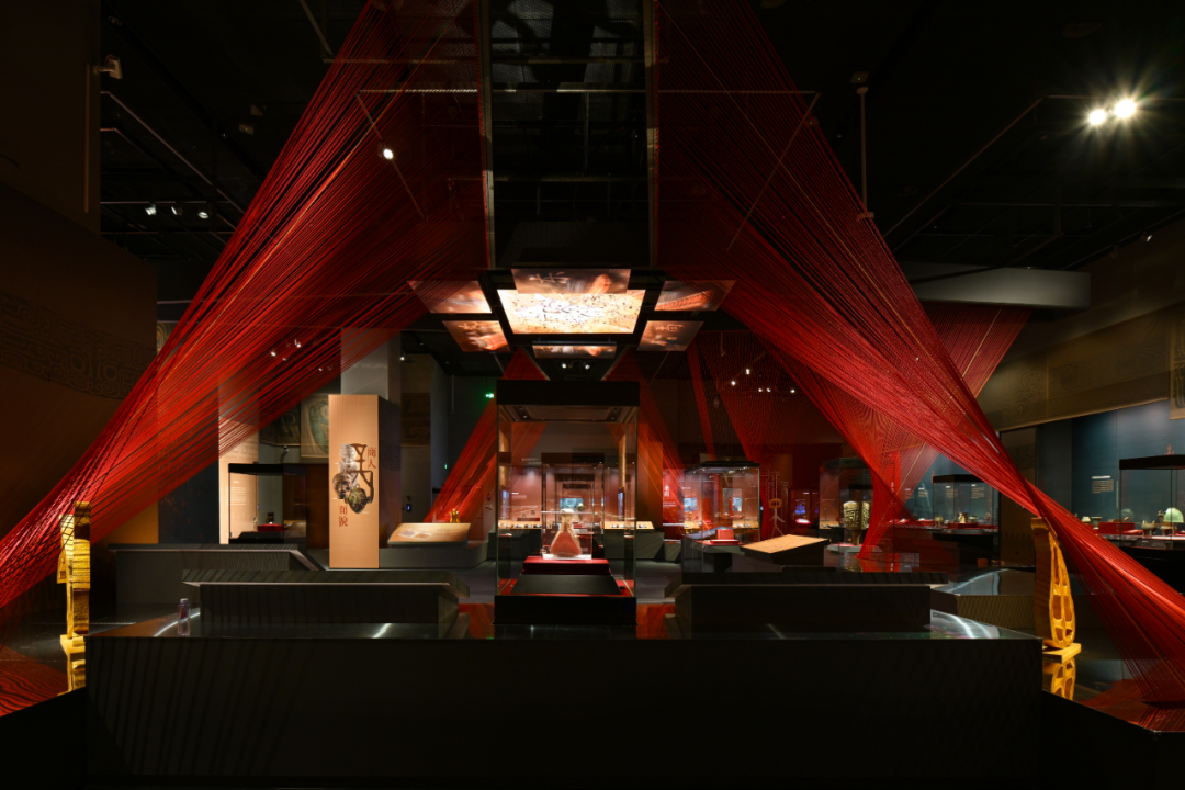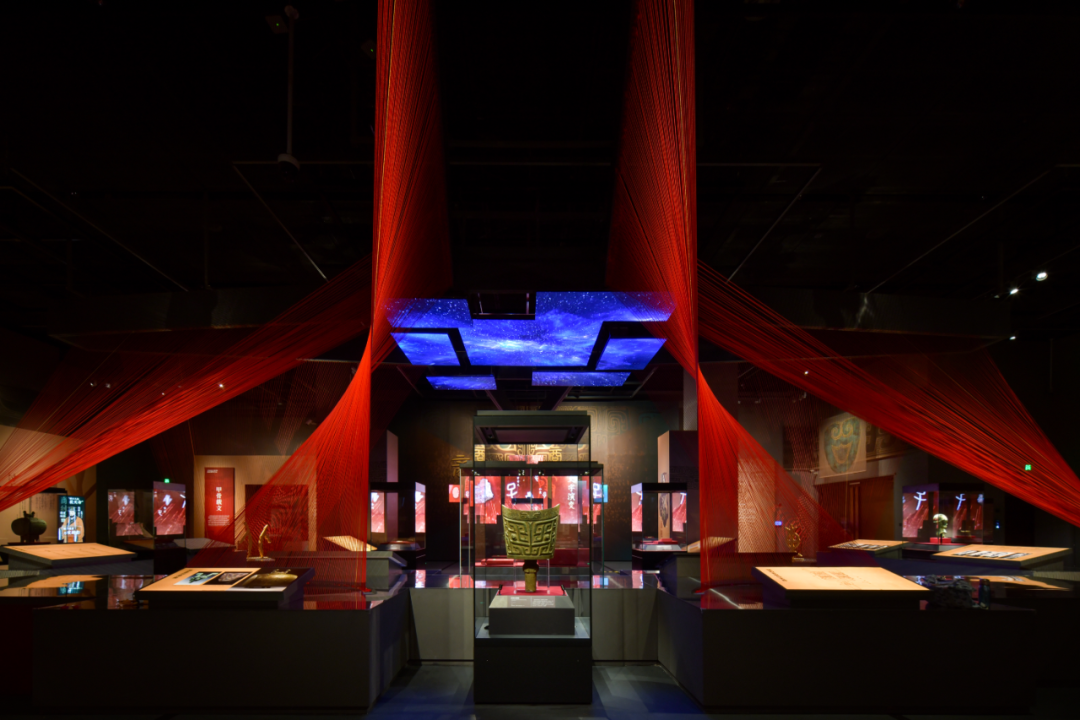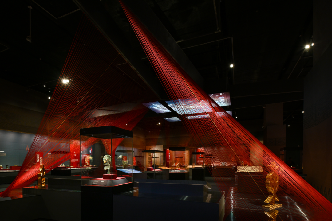 二号展厅贯穿整个展厅的 红色丝线将外服 “四方之地”的展台及展柜,与天花以亚字形大墓为主题的“大邑商”形成空间上的连接,结合媒体屏幕强化王幾与四方的联系,体现文明发展到此阶段,从多元走向一体的步伐正在加快。