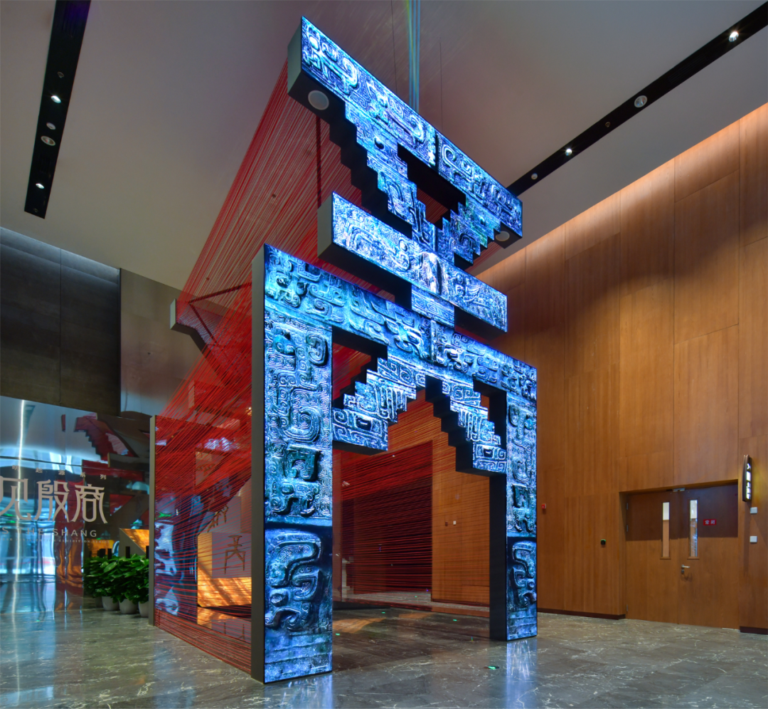 序厅,将展览的主旨利用 led 拼屏形成甲骨文“商”字异形屏,媒体中呈现出商王朝最为经典的青铜纹样从锈迹斑驳蜕变为璀璨夺目的过程,象征着从遗迹中理解商文明的辉煌,“商”字背后用红色丝线形成时空的隧道。观众可以走进其中,端头“见殷商”三个甲骨文再次点题,让观众真正走进商文明。