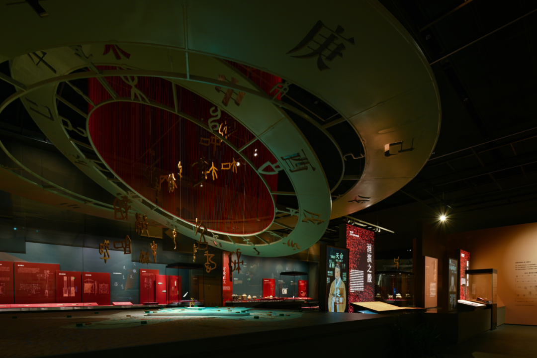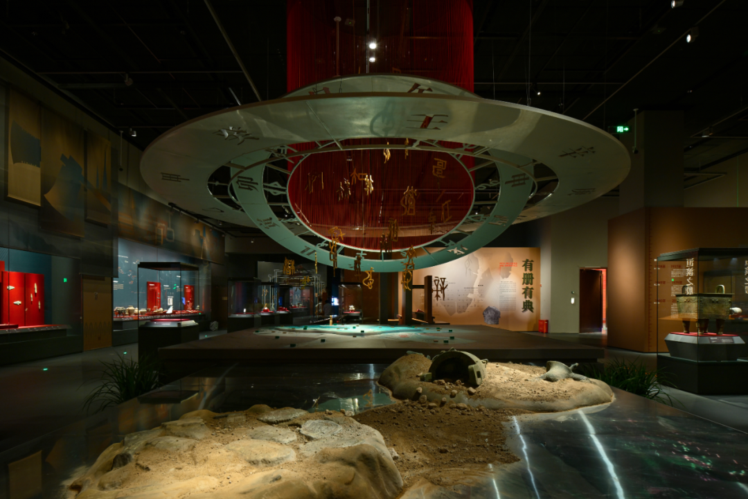 一号展厅中心展示内服(王畿区)“大邑商”的红色丝线垂直连接展厅的天花雕刻天干地支的吊装造型,台面上印制“内服”地理范围和重要地理信息,展现殷商时期天文历法以及周祭制度对商代统治的重要作用;