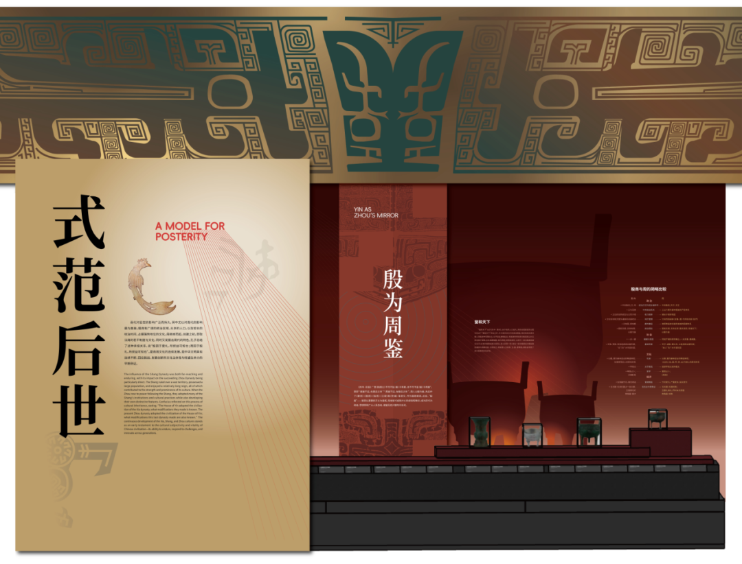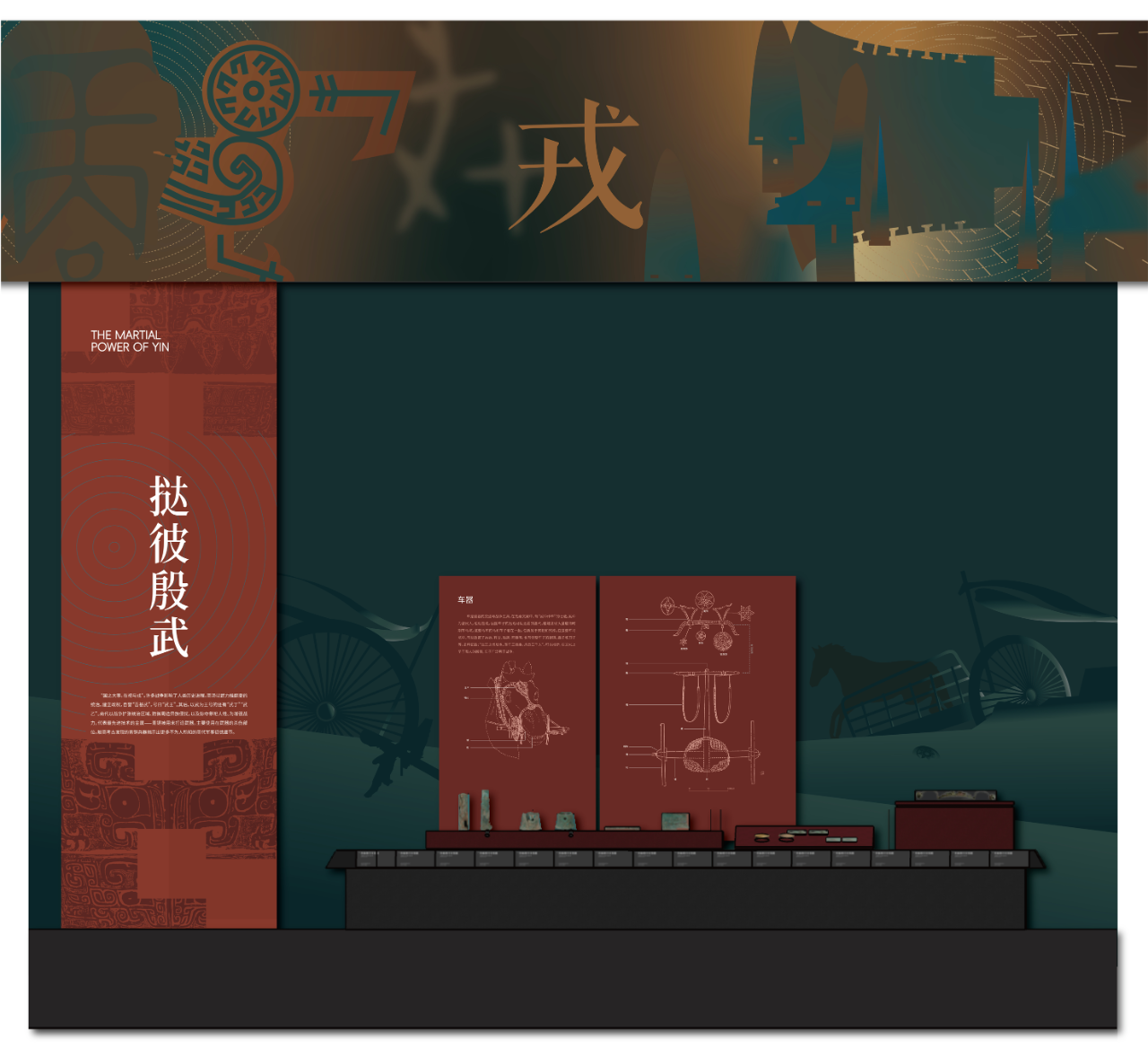 最大限度的解放空间,避免通常以展墙作为空间分隔的方法, 以中心展台结合区域分组等方式,在解决空间动线的基础上,强调了展厅视觉的统一性和可达性,从而 强化 了 商文明的开阔进取、向外辐射、影响深远的文化特征。