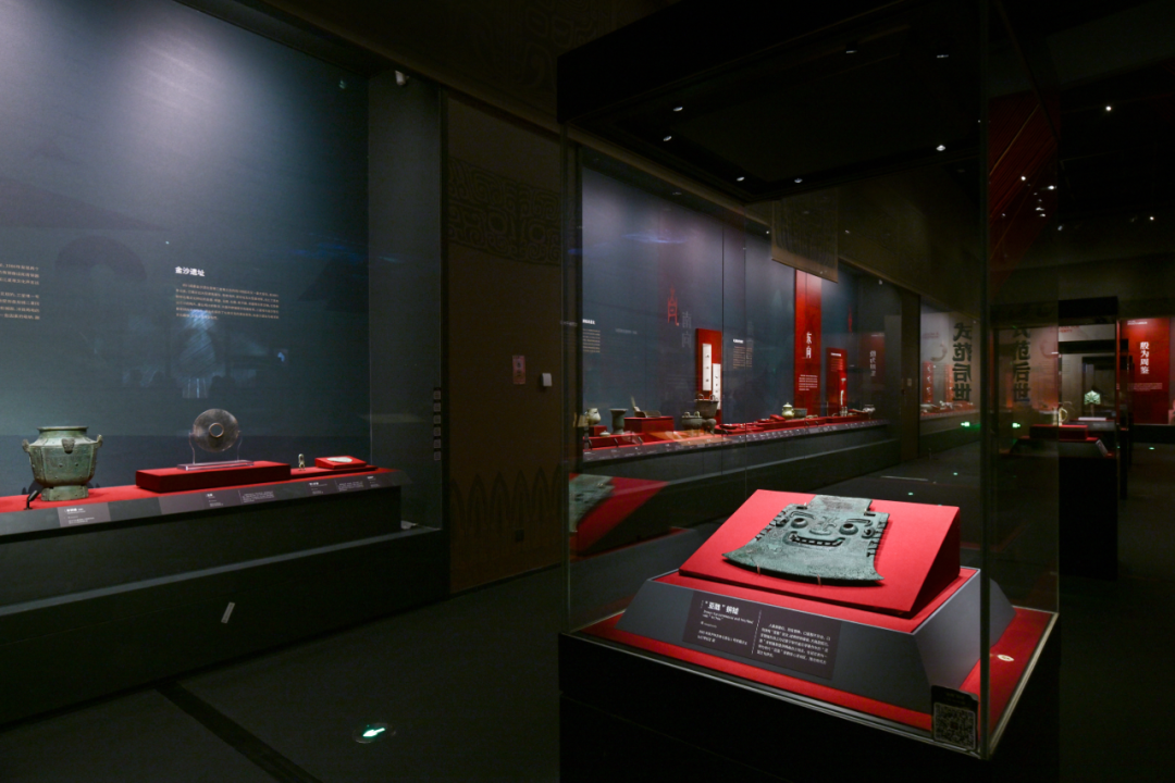不同于传统器物类历史 展的沉稳色调,大胆采用明亮且富有冲击力的色彩,选取代表青铜时代的亚金色和代表血脉赓续的红色为主色调,通过大面积 的色块碰撞与交融,将青铜文明的典型纹样与器型样式结合 不同主题的内容组团分布,使整个展览空间 在版块 节奏 明确的同时呈现统一的视觉氛围 。