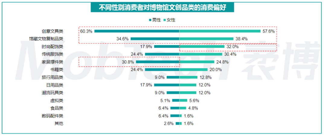 除创意文具类和馆藏文物复制品类外,女性对时尚配饰类更为喜爱,占32.0%;男性则对家居摆件类更为青睐,占30.8%