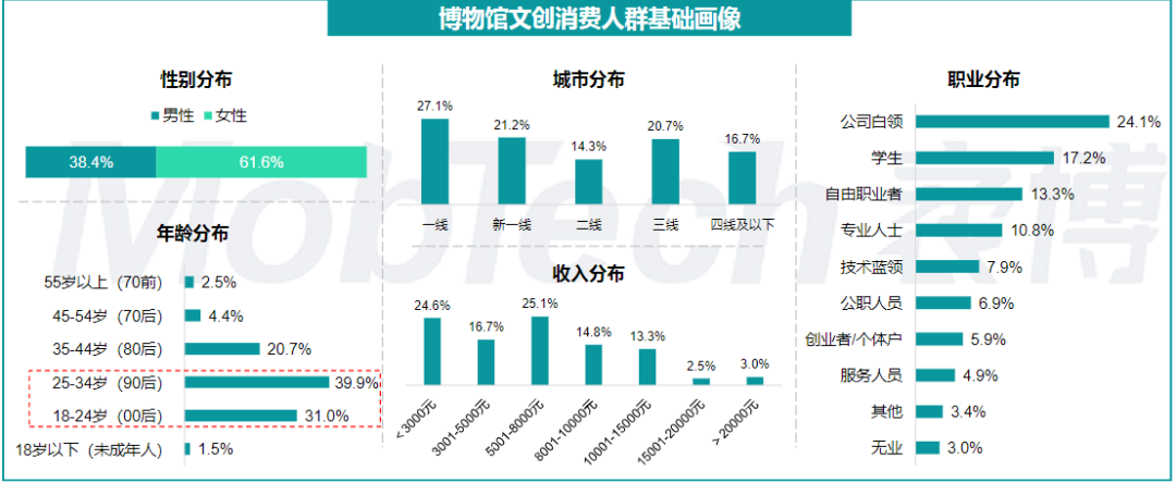 分性别看,博物馆文创消费人群主要为 女性,占61.6% ;分年龄看,00后、90后占比较高, 分别为31.0%、39.9%;分城市看,一线城市消费人群较多,占27.1%