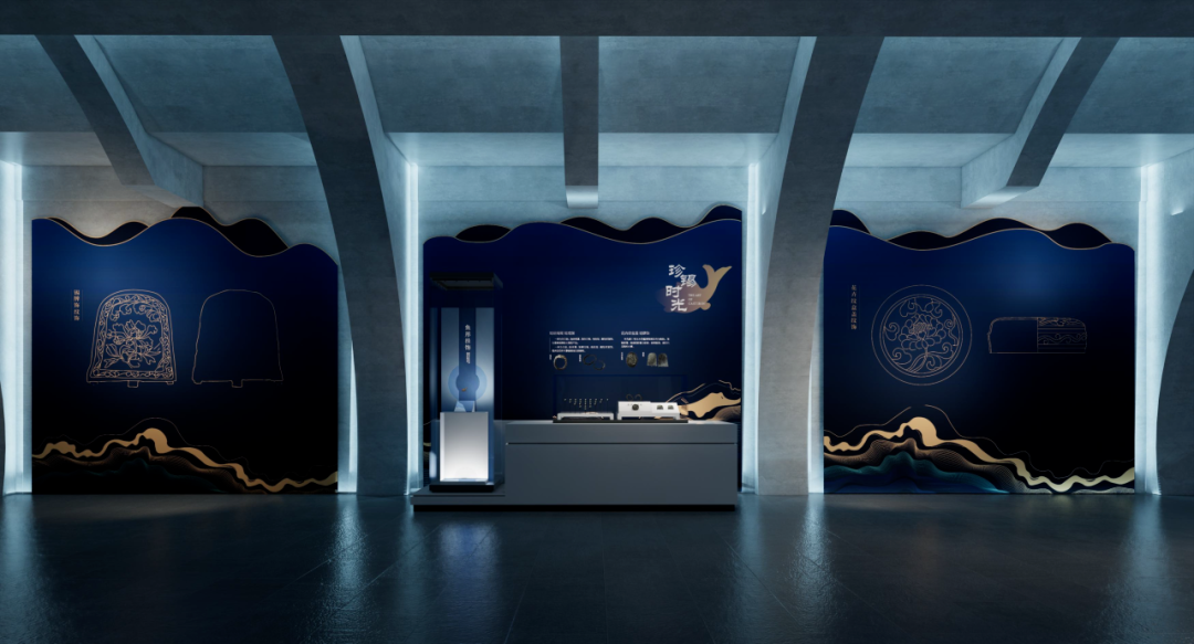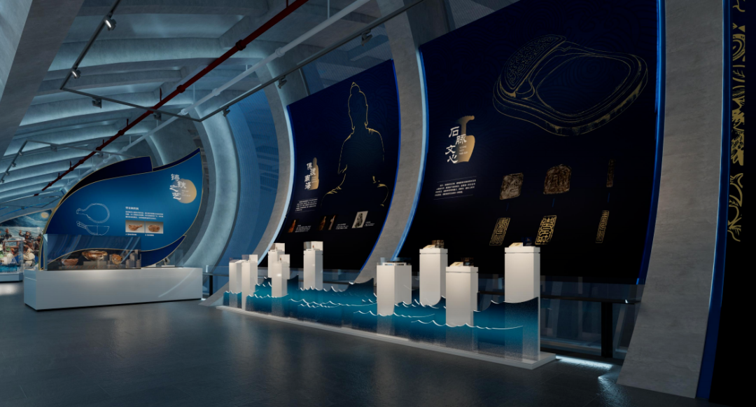 展区分为“寄螺传情”“水润木生”“山海明月凤求凰”等11个主题分区,每个分区均以文物为核心,结合多媒体与艺术装置,构建多层次的叙事空间。例如,“寄螺传情”展区通过中置独立展柜陈列海螺雕杯,配合多媒体还原广州市舶司宴饮场景,让观众直观感受宋代海外贸易的盛况;“佛渡南海”展区则以灵活的台面柜结合图文展板与多媒体互动,展示佛教文化通过海上丝绸之路的传播路径。