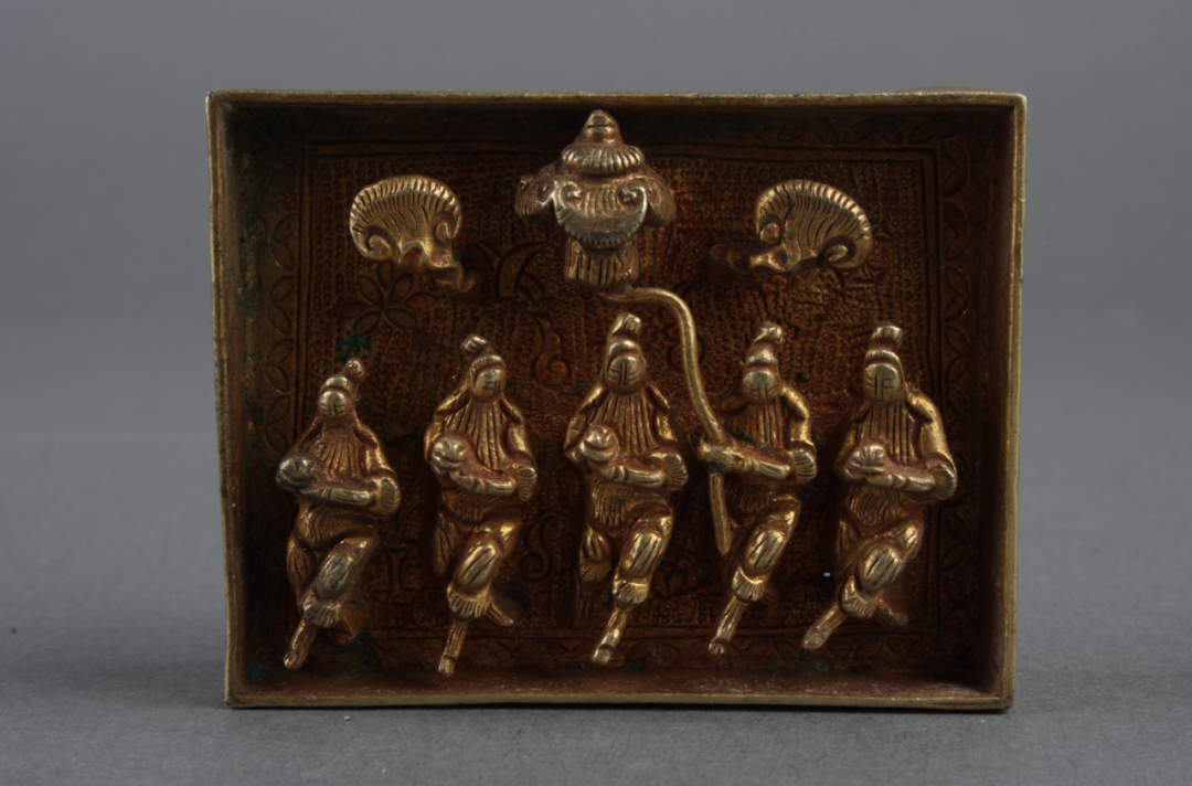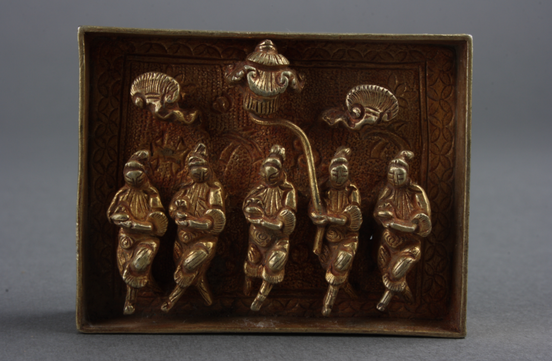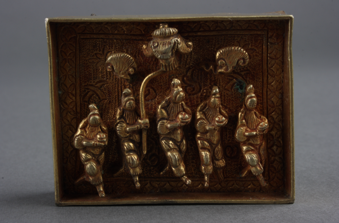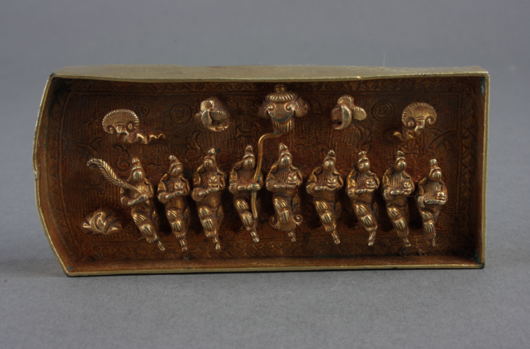 詫 chá 尾是带具的收尾构件,用以保护革带末端,同时兼具美化带具整体的作用。这件詫 chá 尾, 毬路纹围成的边框内,鱼子地上菩萨九位,第六位持曲柄伞盖,第九位持鹤扇,其余执香花盘。排列整齐,如仪仗行进。周围环绕灵芝云及犀角、象牙、金锭、银铤、宝珠、古禄钱等杂宝。