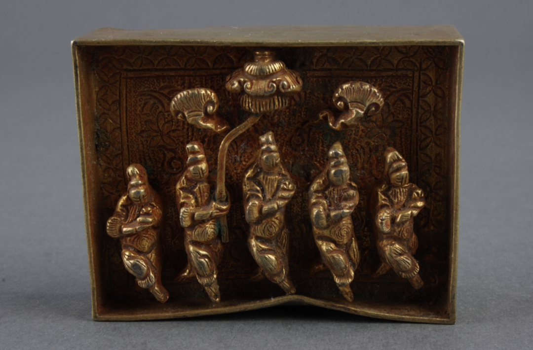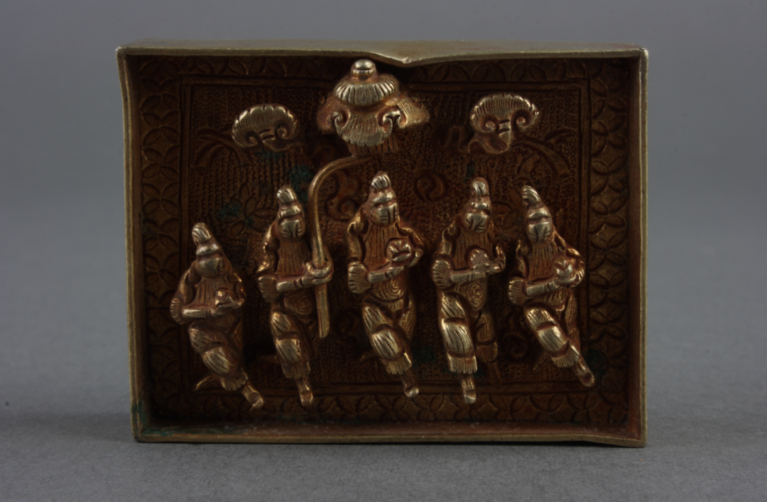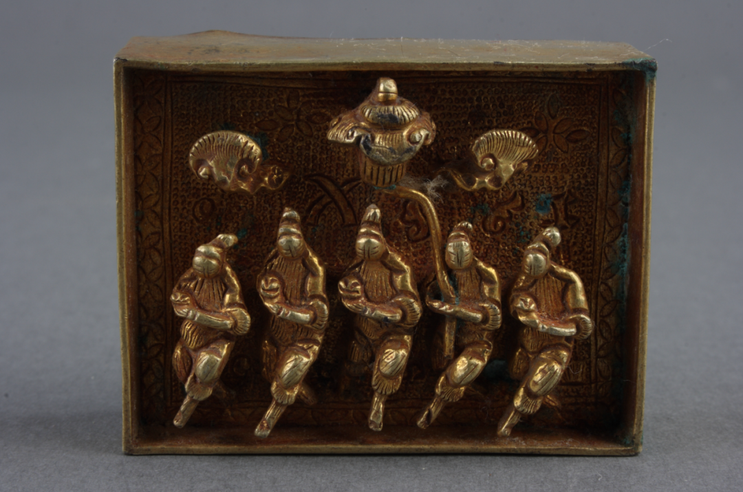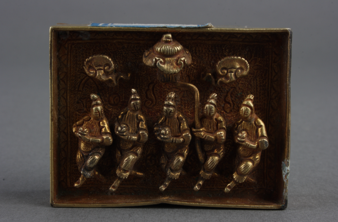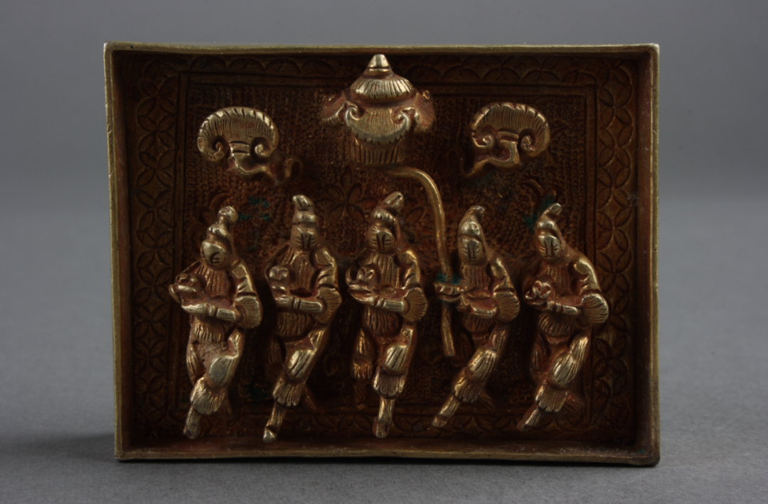 詫 chá 尾是带具的收尾构件,用以保护革带末端,同时兼具美化带具整体的作用。这件詫 chá 尾, 毬路纹围成的边框内,鱼子地上菩萨九位,第六位持曲柄伞盖,第九位持鹤扇,其余执香花盘。排列整齐,如仪仗行进。周围环绕灵芝云及犀角、象牙、金锭、银铤、宝珠、古禄钱等杂宝。