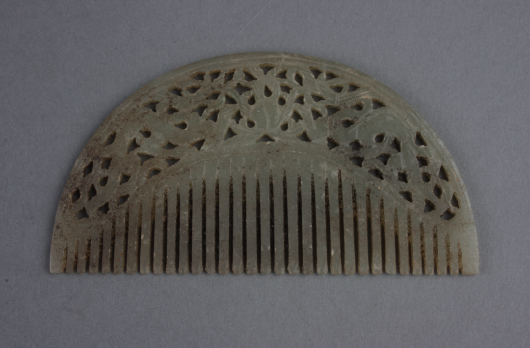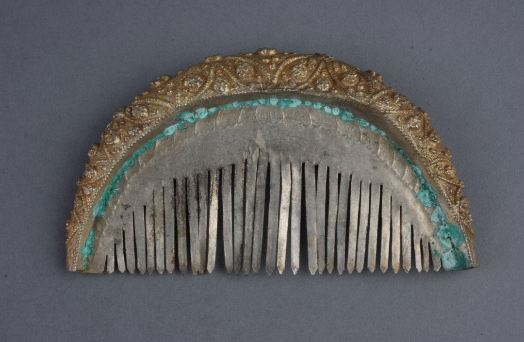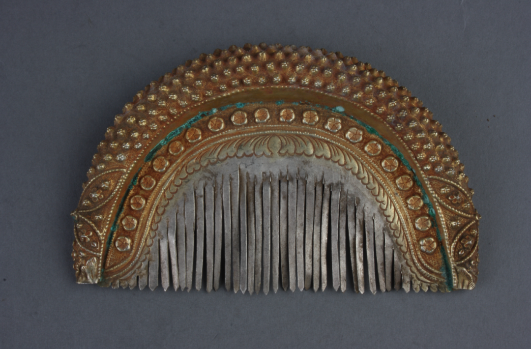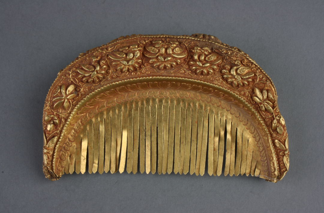 片材打制。梳背毬路纹间点缀花卉,金。梳齿分制,片材上端插焊于梳背,正面沿梳背弧度打制一弯覆莲纹。