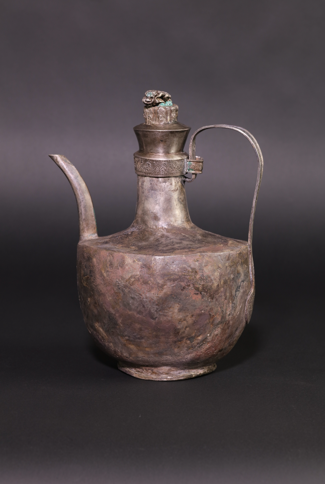 执壶又称注子,与注碗配套组成温酒器具。执壶长颈、折肩,盖钮做成一个二重台,顶端是花台上的一个小狮子,盖钮下面的一重以连珠纹为边框,一周龙牙蕙草,其侧接焊一个桥形鼻,壶柄从中穿过,桥形鼻与壶柄之表均以龙牙蕙草为饰。