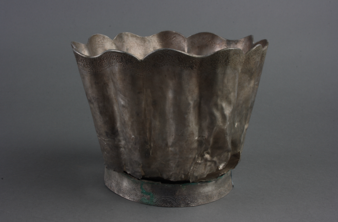 温碗花口,与同出银盏、银执壶形制呼应 ; 口沿、圈足錾龙牙蕙草。錾刻是利用錾子敲打金属表面使金属表面出现印刻图案或呈现凹凸有致的立体装饰纹样的工艺。