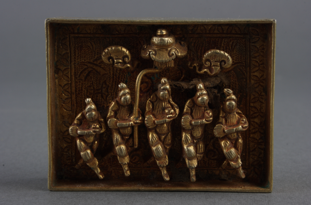 带銙是装饰在腰带上的饰件。十件方銙,均由 毬路纹围成边框,边框内鱼子地上五位菩萨,头顶束高髻,下方覆披巾,衣袖和裤脚都是外翻荷叶边。个个俯首低眉,一人打着曲柄伞,伞两边各飘一朵流云,四人捧盘,盘上一个莲苞,惟方 銙中的一枚,菩萨手里捧的是香盒。 周围环绕灵芝云及犀角、象牙、金锭、银铤、宝珠等杂宝。