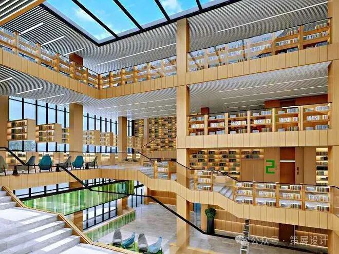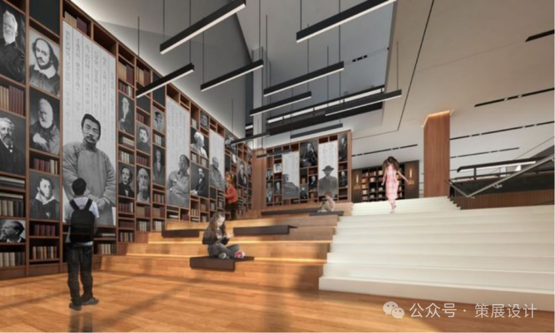 空间合理规划各功能空间,摒弃传统图书馆设计方式,放大山水开化概念,使空间更接近自然环境,营造轻松舒适的阅读氛围。结合建筑特色,创造开放性的光感空间,通透交互,贯穿各阅览区域,密集书墙穿插其间,于“书林”中穿行,对话大师,偶遇经典佳作。