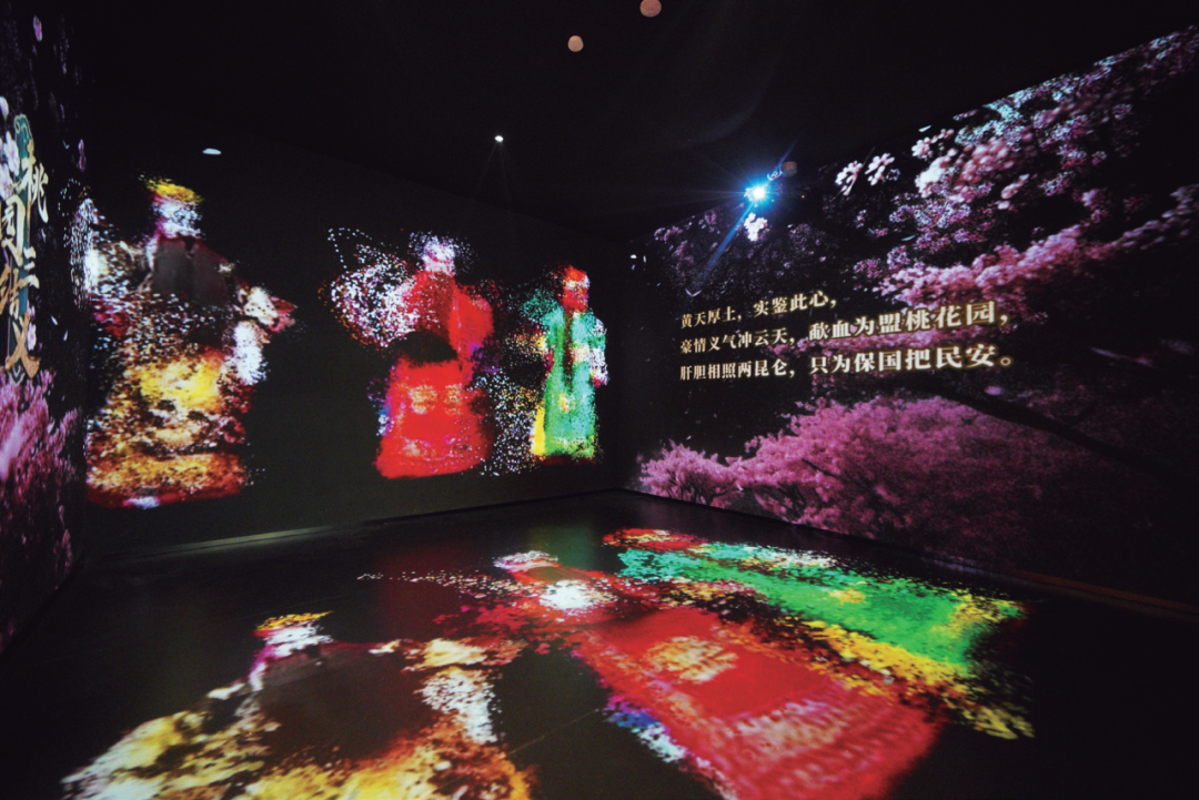 路易·马兰(Louis Marin)认为:“一般的再现确有一种双重的力量——赋予新意和呈现形象。”考虑到专业的戏曲知识对于观众来讲较为枯燥陌生,展览一味照搬剧场舞台会缺少与现实感知的融合、难以达到情感的共鸣。那么如何在展览中再现戏曲艺术在舞台上的光晕(aura),呈现视听美的同时延续“三国戏”中表达的精神内核,是策展团队面临的主要问题。经过一年多的思考,从跨文化设计理论出发,团队厘清内容脉络,梳理出合理的逻辑关系,并在一些关键节点上实验性地创新了展示内容,通过形式设计对内容的提炼,达到展览策划传播目标,创造了一个引发记忆震荡的艺术剧场(图4)。