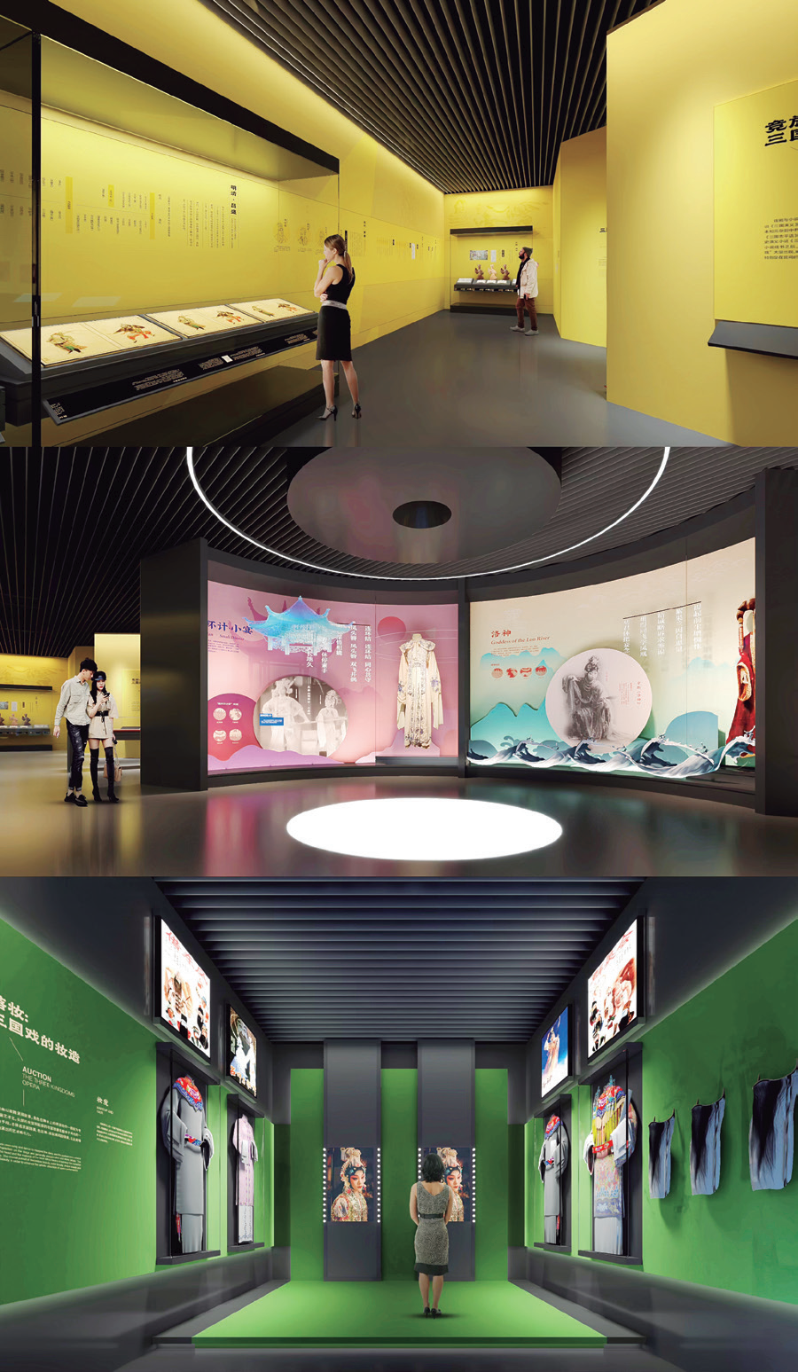 通过提取图像来处理色彩和历史信息的关系,策展团队的主要意图是创造一种独特的剧场体验,远离了剧院中“观演关系”的惯例。展览不同墙面的大面积色彩,既可以突出展览信息,也可以区分和统一空间。这种色彩运用营造了一系列看似脱离周围设计元素的设计思路,打开了通向变革空间的记忆之门。通过引入创作人第一视角,将个人主观对“三国戏”的理解感悟独创性地融入其中是展览呈现的精髓。首先,展览整体以洛神朱色为主色调,体现“汉尚赤”的色彩理念,再结合每个单元展览内容提取不同的主题色彩,以颜色的变化展示“三国戏”多样情绪。每个单元结合展览内容和展品特性提炼出不同的主题色彩,以颜色的差异化提示观众展示内容和场景的切换,烘托戏曲中故事情节的起伏,同时把握观展节奏,在序厅,采用红色幕帘与茶味香氛做搭配,还原剧场场景,让观众形成一种走进戏院看戏的氛围,隔绝外部环境干扰。走进展厅,版面色彩逐渐明亮,随着文物类型、图版内容、场景塑造等逐渐丰富,展览节奏也开始加快;如第一单元“案下源考”主要梳理“三国戏”的源流和发展,展示文物以平面纸本居多。以剧本、戏单中提取的充满静谧感的淡蜜黄为主色调,让观众走过气氛活跃的序厅后能舒缓沉静地进入“三国戏”历史空间。第二单元“粉墨传奇”展示京剧、昆曲中的三出经典“三国戏”:《空城计》《连环计·小宴》《洛神》。每出戏安排在了一个相对独立的板块,版面、装置、场景的色调统一,不间断的强烈视觉冲击让观众领悟到故事高潮的到来,为不同的戏曲情感阐述做好铺垫。《空城计》整段戏以斗智和心理战为主要表现手法,在图版上采用牡丹红色、沙青色渲染紧张肃杀的气氛;《连环计·小宴》是“三国戏”中少有的情感类文戏,图版则以渥赭色、丁香色照映戏中狡黠与机智、诱惑与妩媚、矛盾与挣扎、愤怒与仇恨、悲悯与无奈的多层情绪表达;《洛神》主要描写一段虚无缥缈的爱情故事,图版选择以碧玉石色、月白色衬托洛神超凡脱俗的仙人气质。第三单元“镜里梳黄”展现盔帽、妆发、戏服、乐器和砌末道具在“三国戏”中的运用。在文物展示区域,选择回归第一单元使用的淡蜜黄为背景色,调和整个展厅色彩变化过于纷繁复杂这一弊端。后半部分“龙吟大剧院”场景当中,在顶面、地面和墙面统一使用松柏绿色,由统一的视觉环境带领观众穿过舞台走入化妆间,一探戏曲演员在背后的准备步骤。尾厅再次启用序厅的洛神朱色,达到首尾呼应,让观众从展厅回归剧场,欣赏“三国戏”自剧场衍生而出的电影、电视、歌曲、游戏等多学科精彩(图5)。