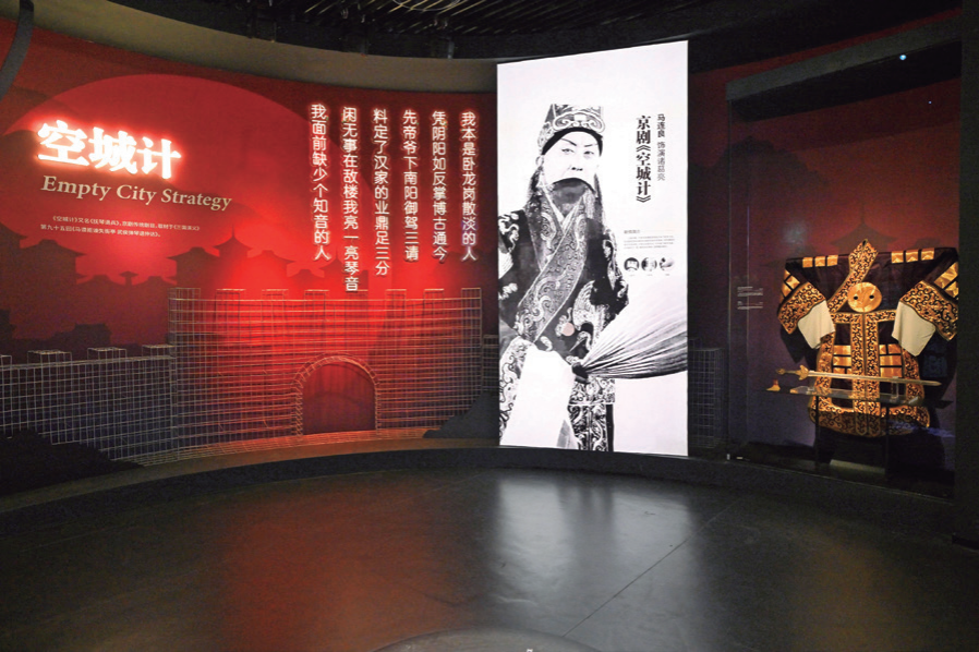艺术是需要阐释的,展示艺术品的博物馆也是如此。视觉在信息阐释中占有重要的地位,而色彩则是最直接、最有表达力度的元素,在空间构成、信息传达和情绪调度中扮演着重要角色。戏曲艺术不仅将故事剧情、人物特点和思辨精神浓缩融合在舞台之上,同时在其发展过程中也形成了浓墨重彩的舞台视觉标签。如诸葛亮在戏曲舞台上多为“头戴八卦巾、身穿八卦衣”的造型,以此表现足智多谋的角色特质。这样常见的美学范式使戏曲在视觉与思想方面达到了统一。展览在选择色彩时运用CDS(ColorDesignSystem)色彩理论,践行“色彩的物理特性与中国传统色彩哲意的视觉表现构成一种色彩心理评价”理论逻辑,让具有视觉冲击力的色彩成为观众与剧中人情感共鸣的桥梁。