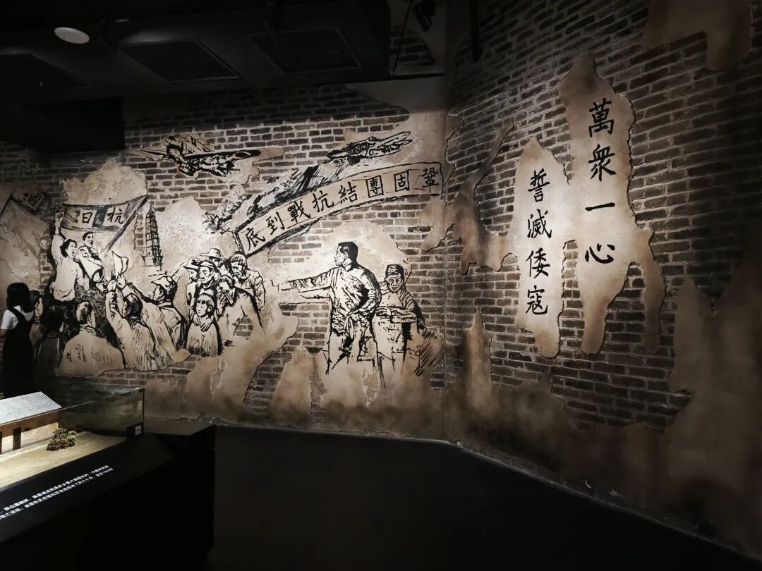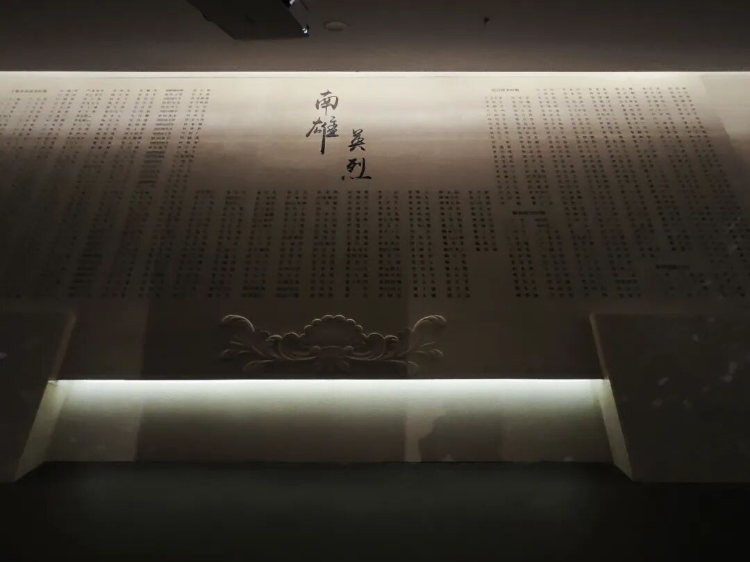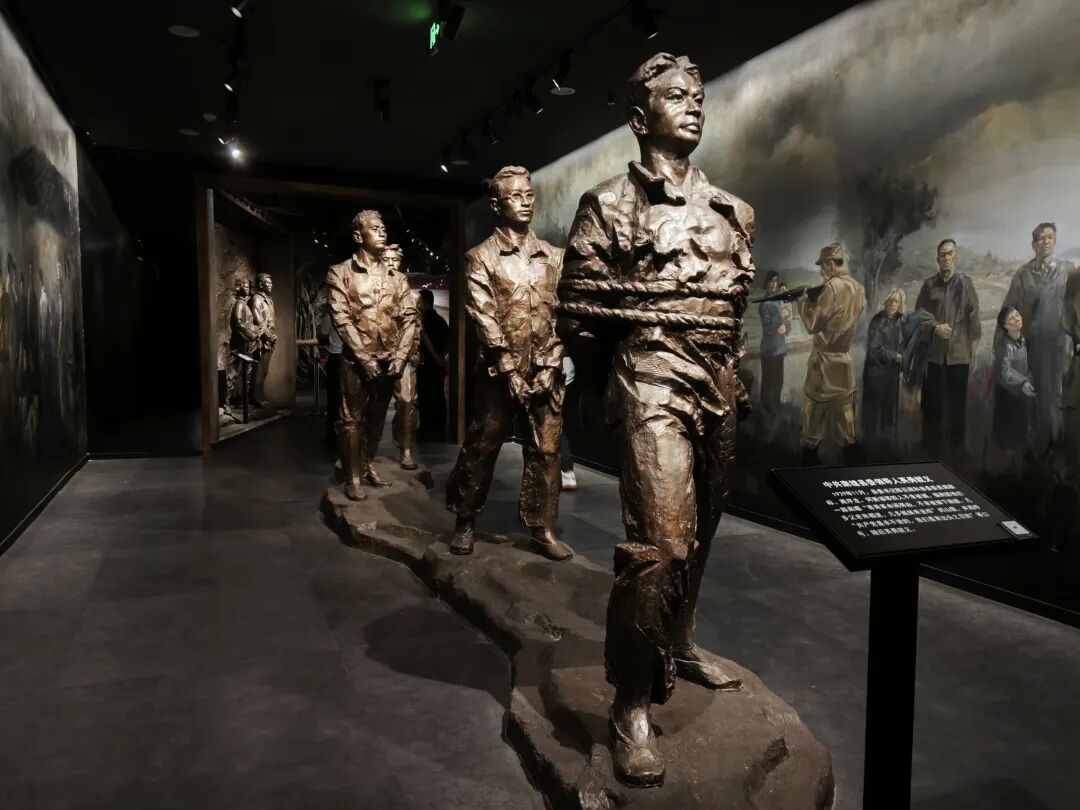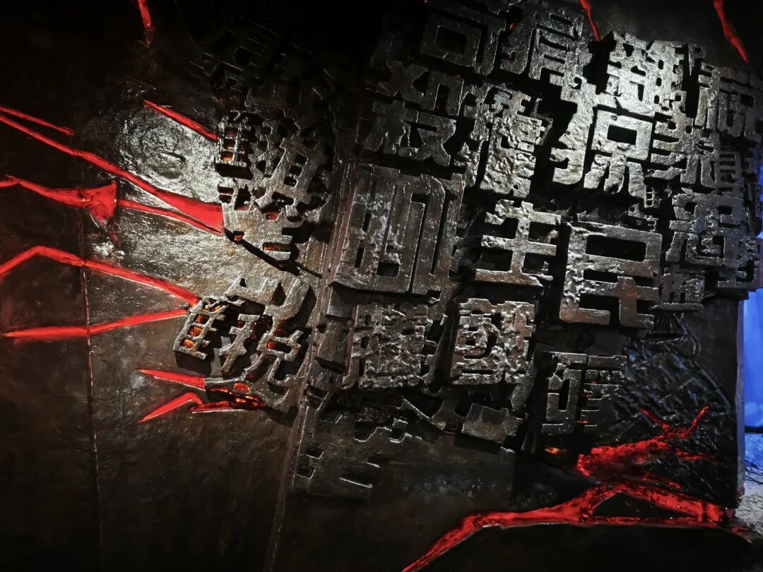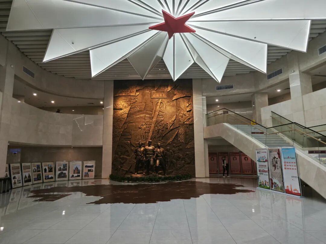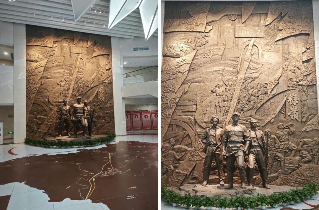作为全馆的序幕空间,中心大堂采用了大型雕塑墙与天幕艺术装置的组合设计,浮雕红旗漫卷的形态结合篆体“雄”字,画面中红旗漫卷,以南粤雄关、梅花、一线抗战志士和后方支援群众作为主体元素,象征“雄关漫道真如铁”;红星天幕将自然光巧妙引入,落向跨层雕塑墙,让墙上革命者宛如自历史中走来。