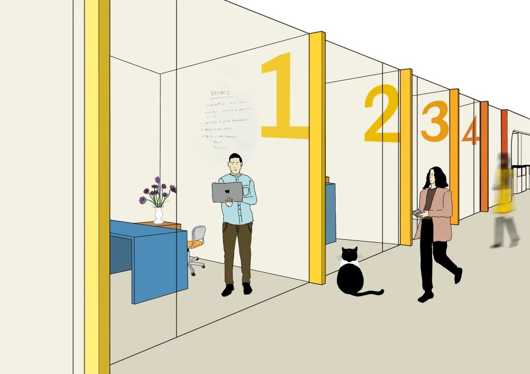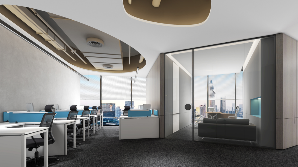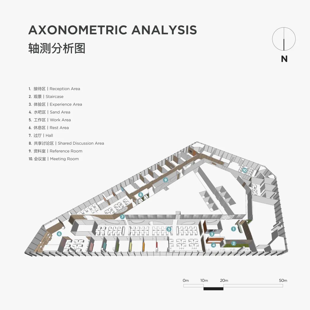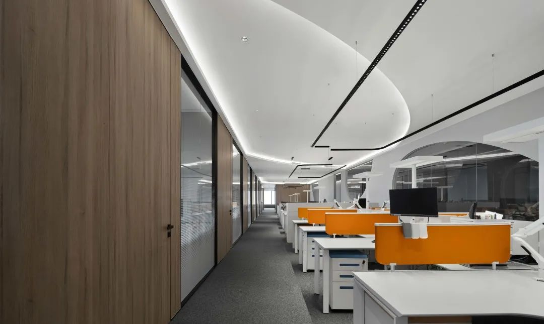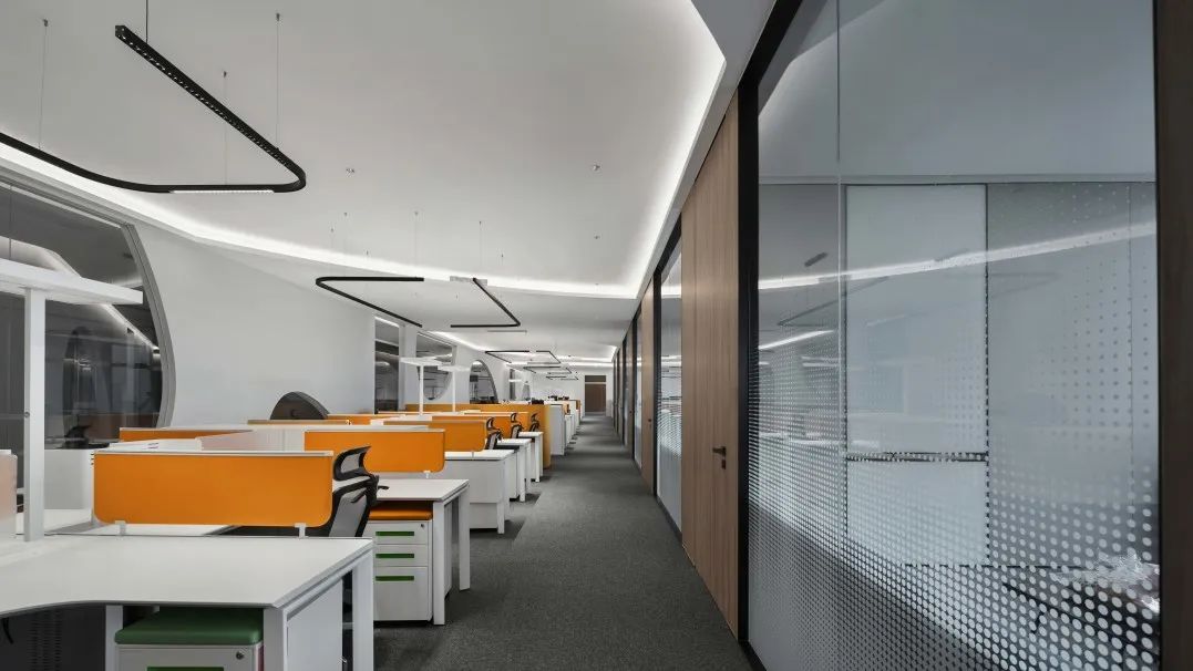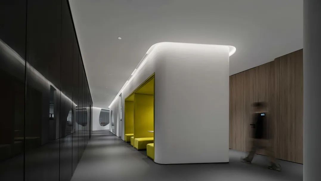 提及游乐公园,首先浮现在脑海中的印象里想来过山车必有一席之地。以此为意象,过山车起伏的轨道转化为部门空间与过道间墙体上的弧线,线条勾勒出的范围以玻璃填充,点缀之余也让空间的体量感更加明晰,各个区域间的视觉得以贯通。