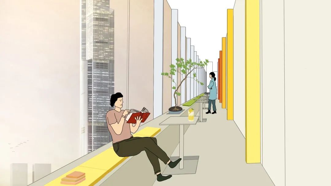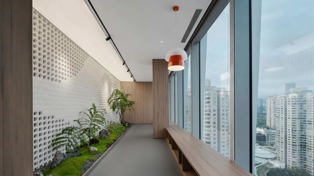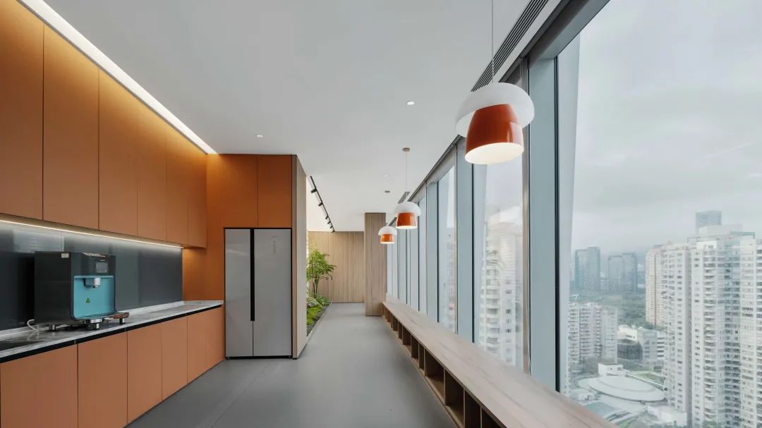 工作之余来到茶水间补给小憩,落地窗外城市的繁华与办公室内的安静互相映衬。隔断旁生机盎然的绿植仿佛在悄然提醒,个人的放松岛屿可以不只是在心中,也在与工作息息相关的场所里。