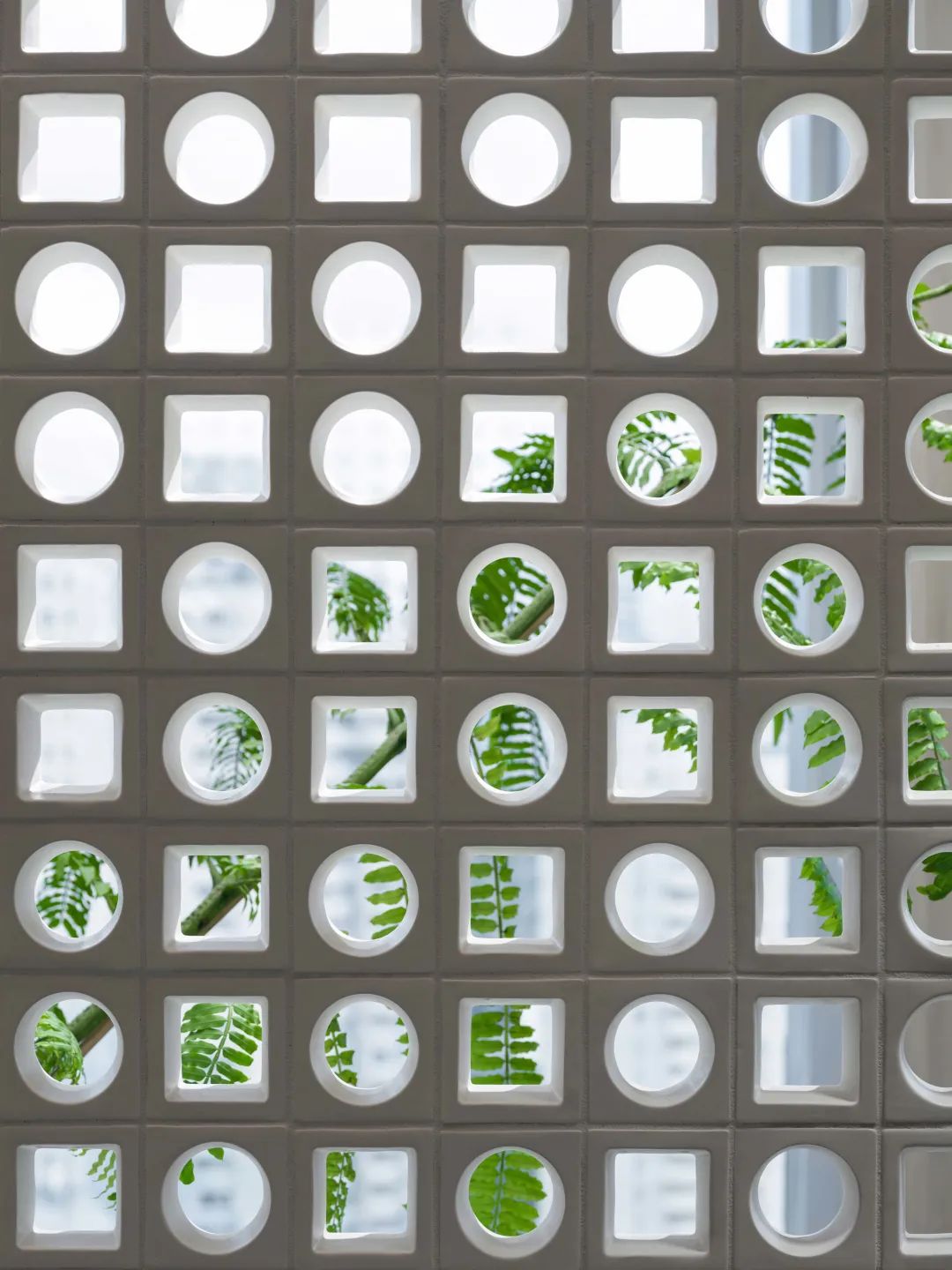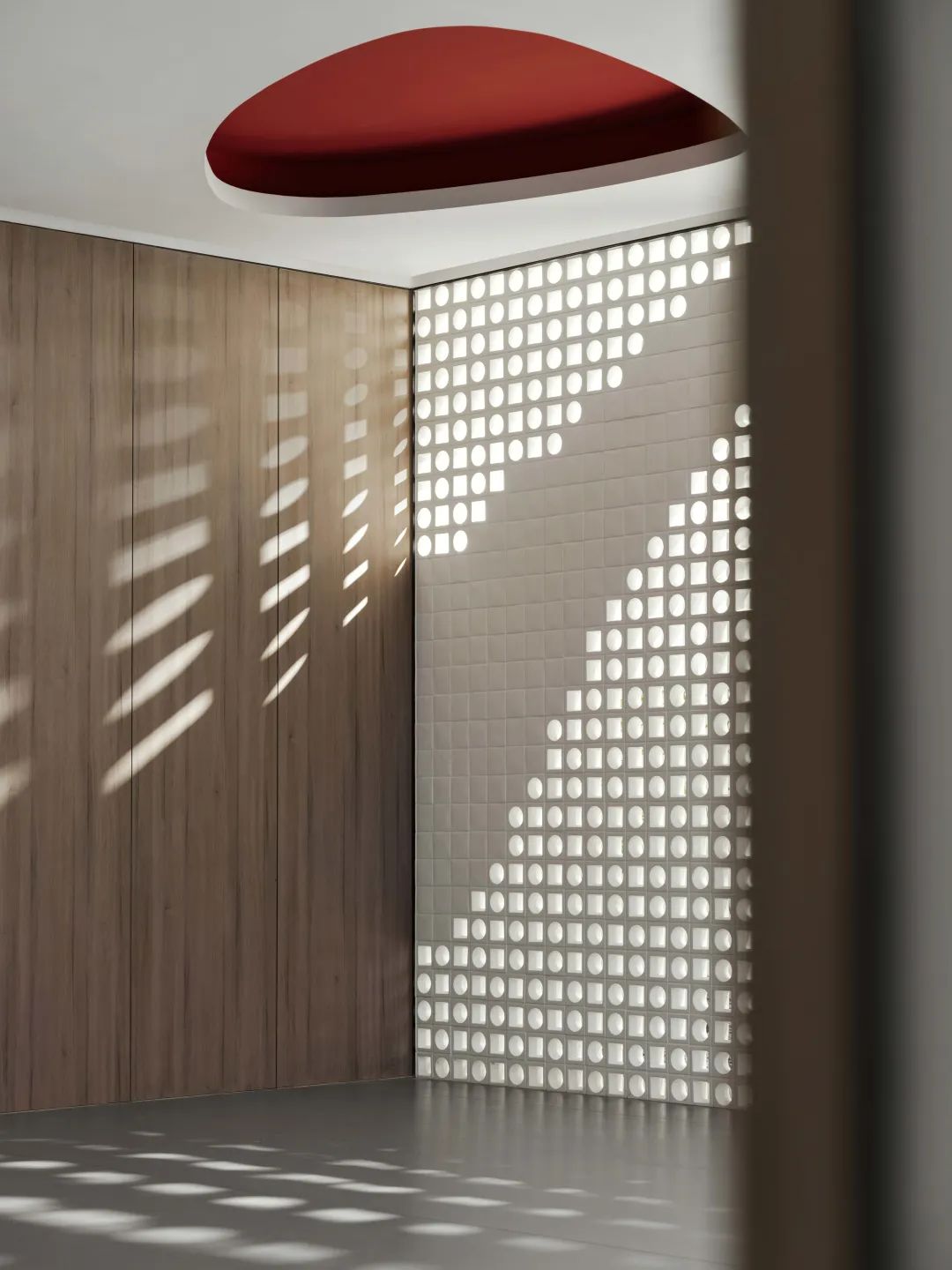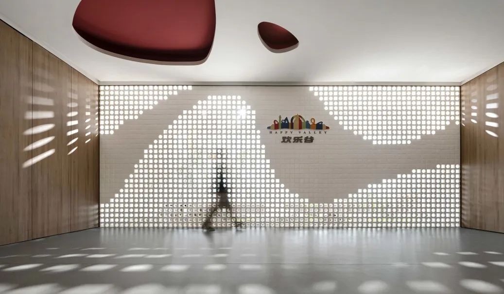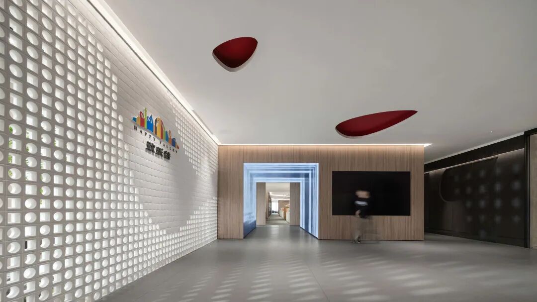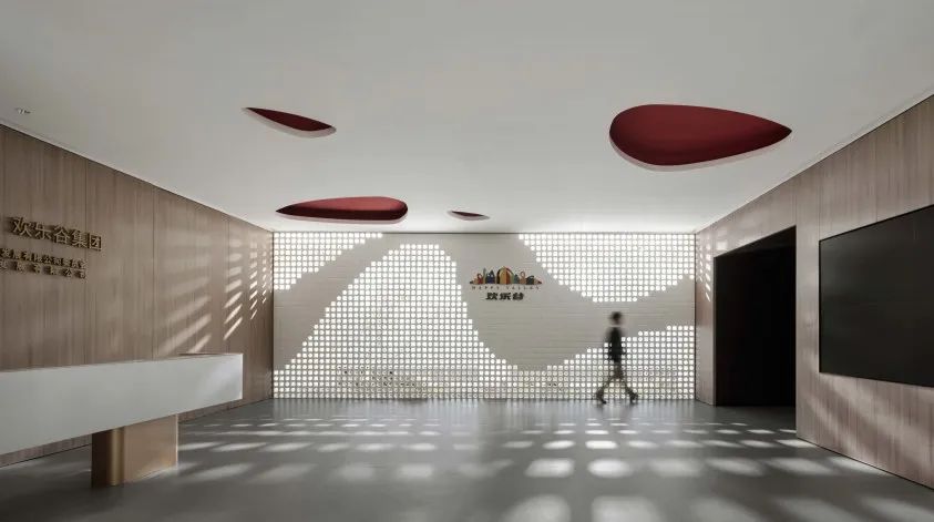 接 待区的墙壁仍以木饰面为主,而与共享茶水间之间的隔断则特别使用镂空处理,将方形和圆形的开口从简单的形状转化为修饰手段,将外界的光线滤成光斑洒进室内。 另一侧的植物透过镂空隔断影影绰绰,一片生机,一如欢乐谷的氛围。