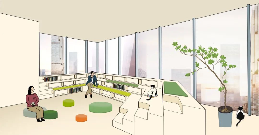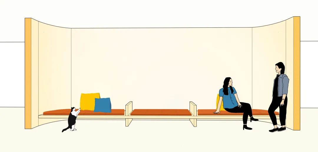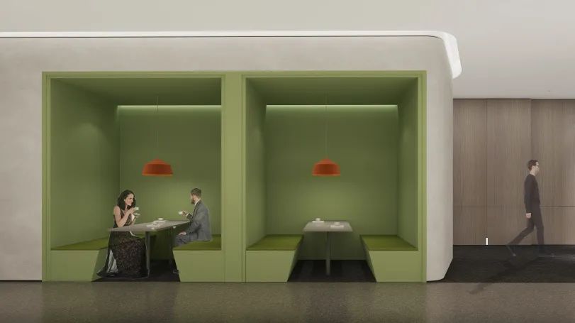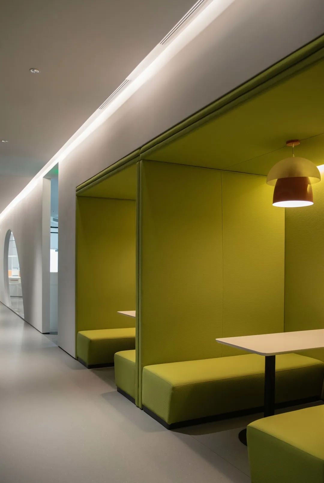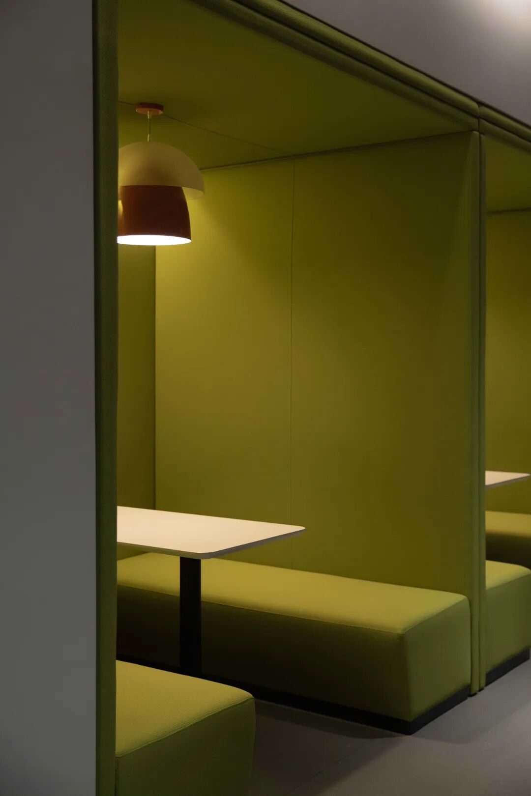 共享讨论区以卡座的形式呈现,拉近了人们的互动距离。使用的绿洲色在绿色幽静的基础上多添了一些黄色的活泼与温暖,平衡了冷暖感觉,使讨论区的氛围更加舒适。