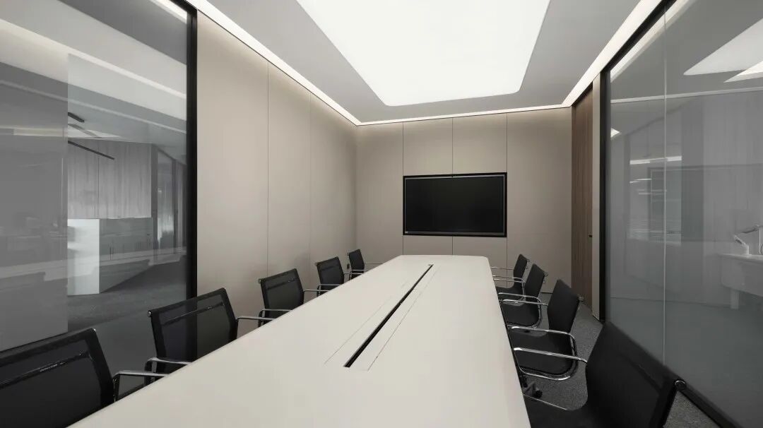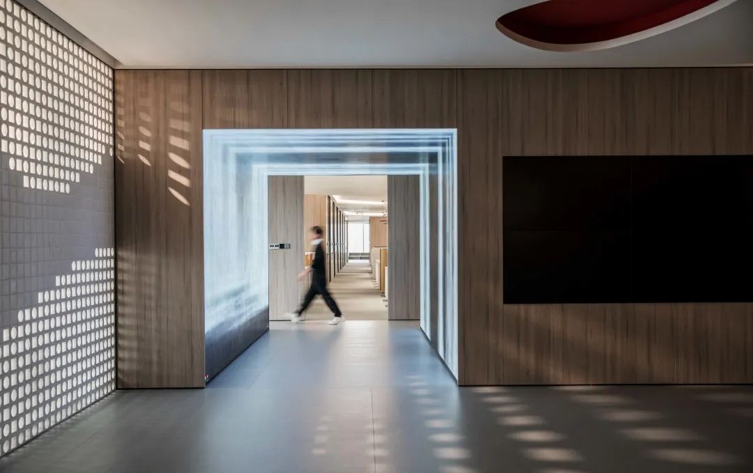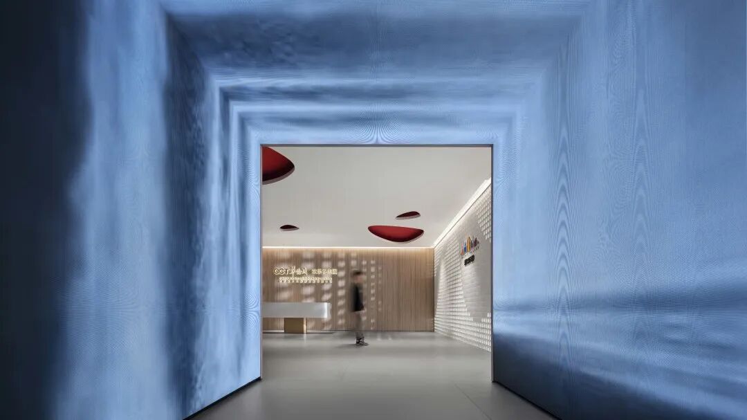 通往办公区域的走道三面环绕电子屏,大面积的电子屏幕使用在最大程度上增强了感官效果。不仅为经过走道的这一段路带来沉浸式体验,也卸下了一些固有印象中办公场所正式并且传统的感觉,以安静的形式增添动态的活力。