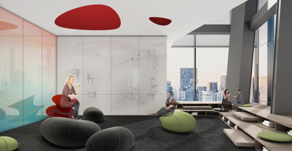 在这个办公空间中,集团应有的正规与气度和产出内容的活泼调性得到结合。鲜明的色彩点缀着人们日常忙碌的空间,游乐公园中过山车等娱乐项目的弧形也被转化成勾勒空间视觉效果的线条。