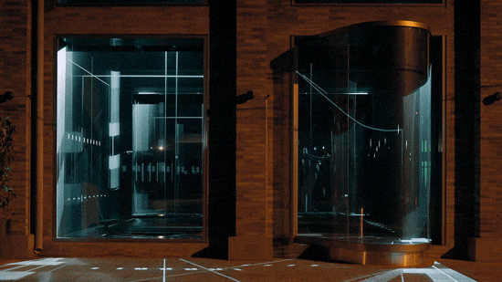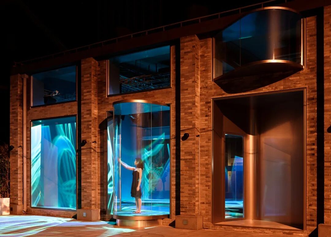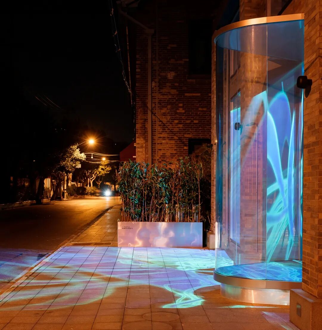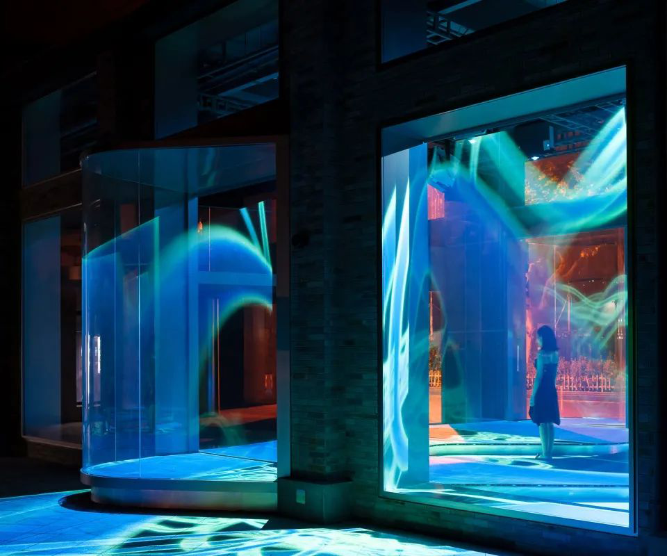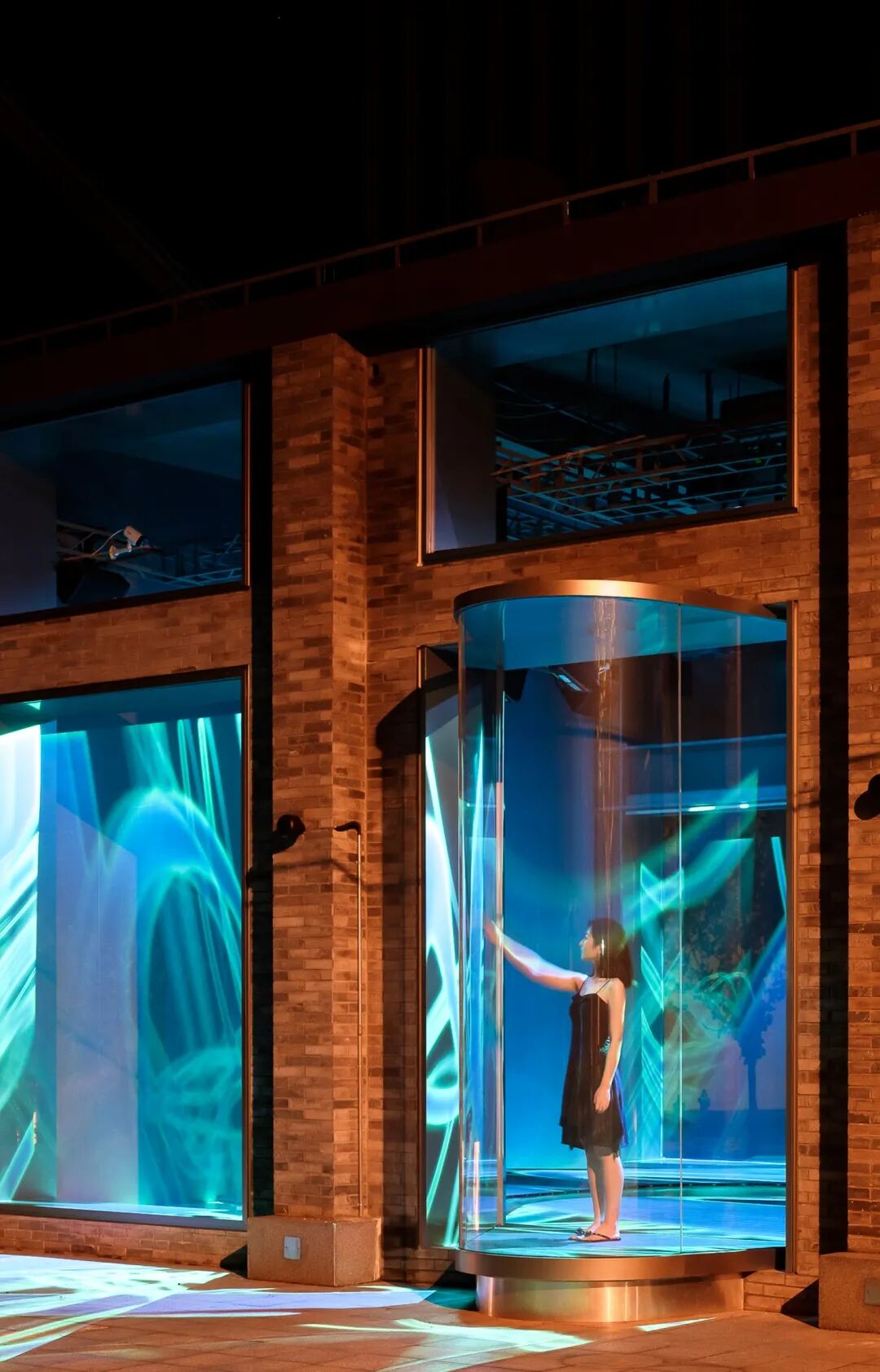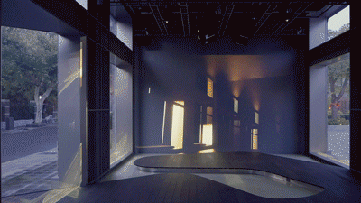 Therefore, inside the exhibition hall, viewers can experience the superimposition and interaction of virtual and real images of multiple images, which expands the sense of depth of space. When viewing from the outside, they can appreciate the "moving scene" style light and shadow displayed on different window interfaces, which is more mysterious.