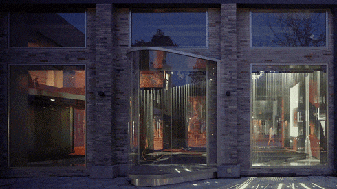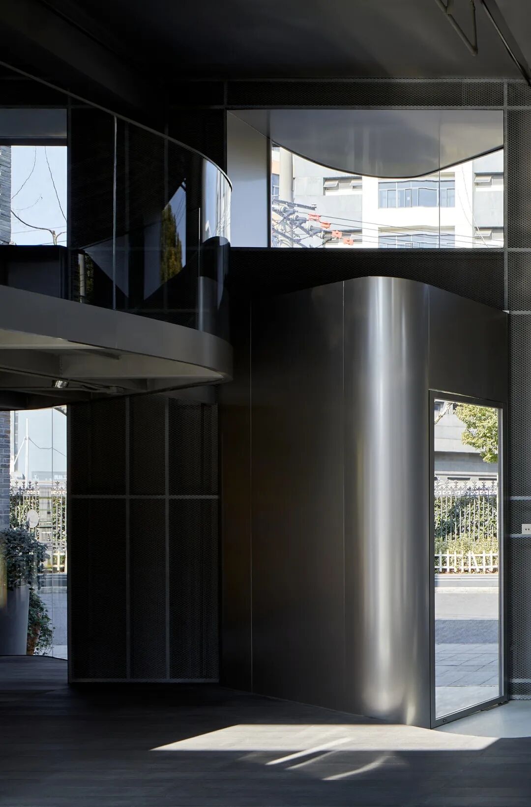 在开窗的位置嵌入若干向外凸出的弧形玻璃界面作为建筑内部空间的延伸,这些曲面玻璃上覆有高科技全息膜既可保证玻璃的通透性又能接收清晰的投影图像白天,它们可以是完全消隐的而在夜晚,它们则将室内“流动的盛宴”外溢到街面同时也将室外的街道、路灯、行人等现实世界元素,纳入室内观众的视野。