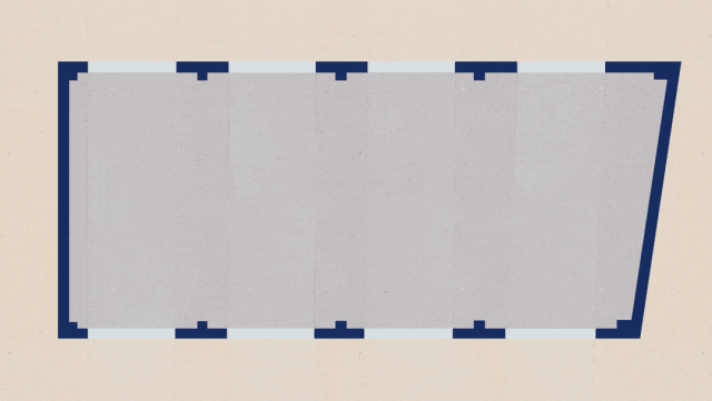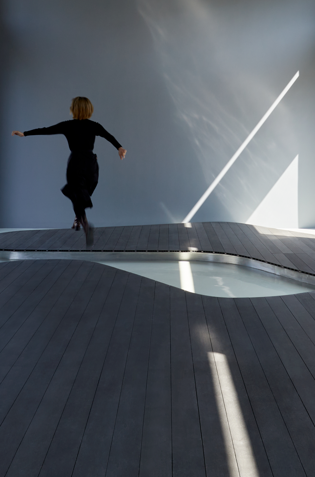首先,依据开窗位置将观者不同角度的视线连缀起来在平面上实体化为曲折、有趣的路径,每条路径尺寸的大小都在变化去提醒参观者调动自己的身体鼓励需参观者迈大步或跳过的方式与光影和场地互动。