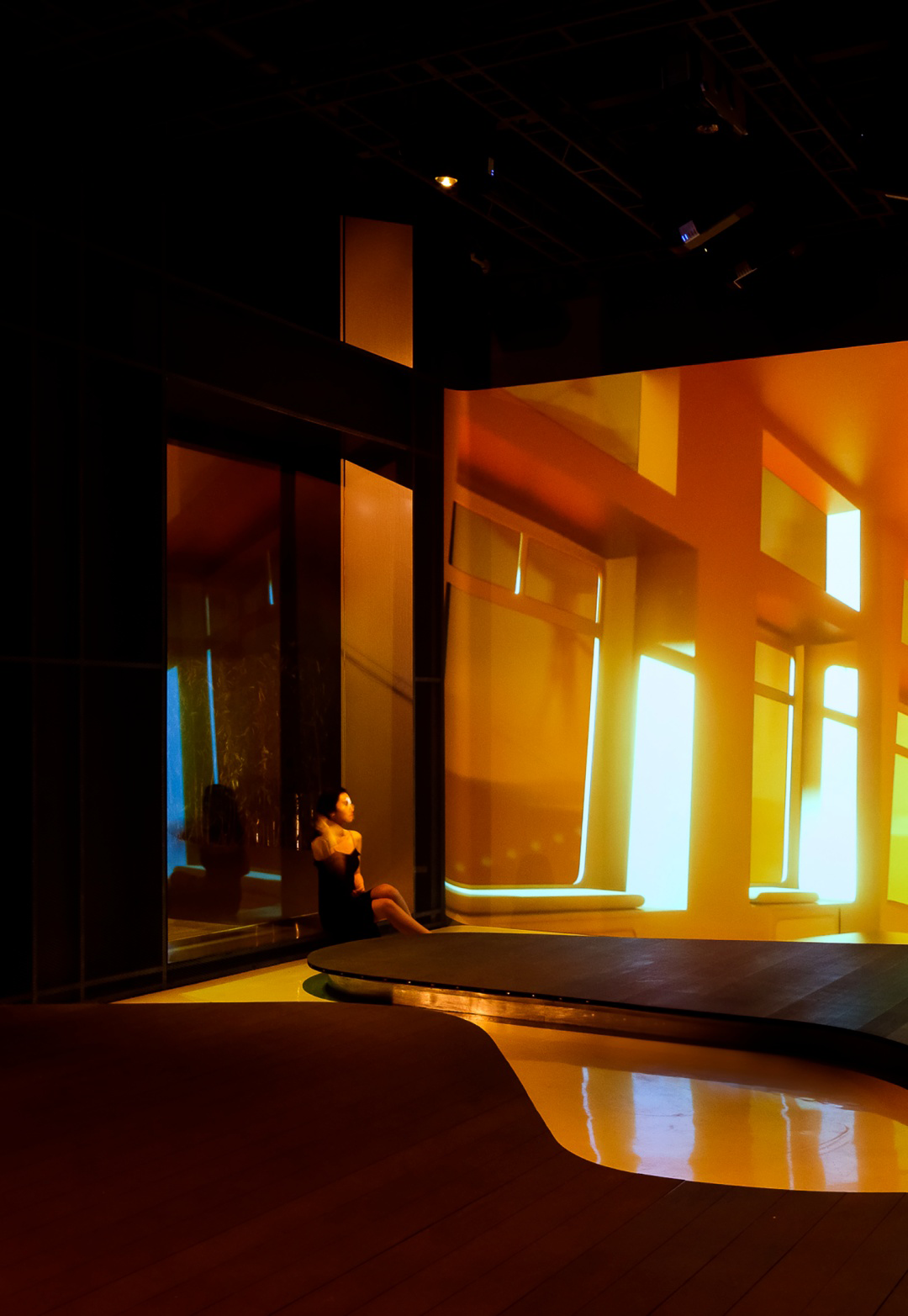 于是,观者在展馆内部可体验到多重影像的虚实叠合交互,拓展空间纵深感而从外部观瞧,则能领略不同窗口界面展现的“移步换景”式光影更具“窥豹一斑”的神秘感。