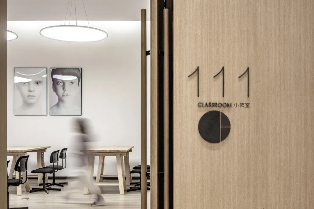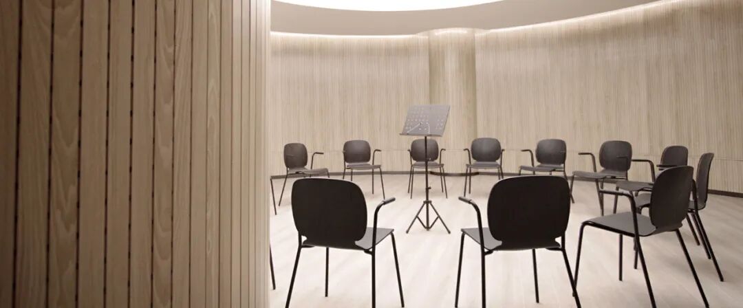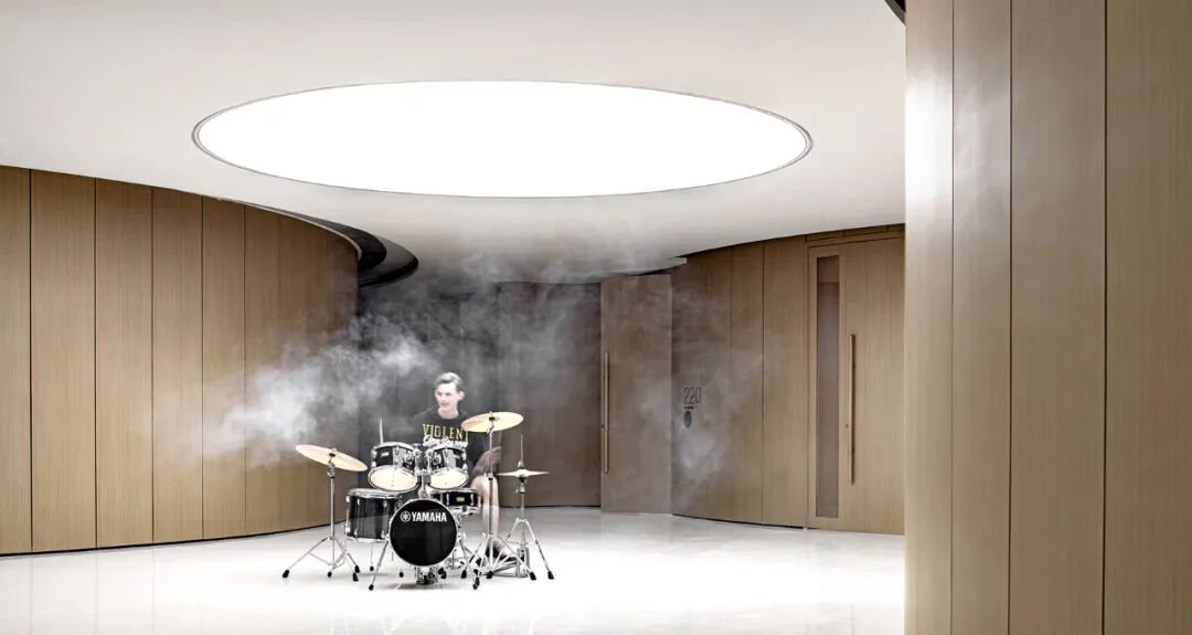 而在二层,沿窗边自然光最充足的是美术课室,中间是乐器教室的组团和一对一钢琴室,而最深入的课室则是带有专业隔音系统的声乐教室团组。