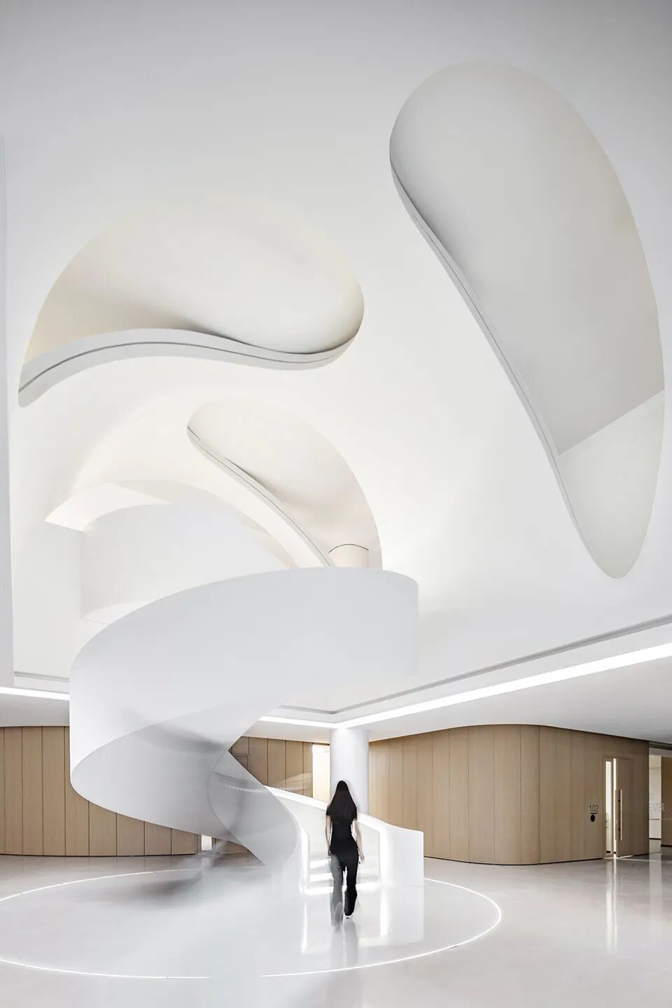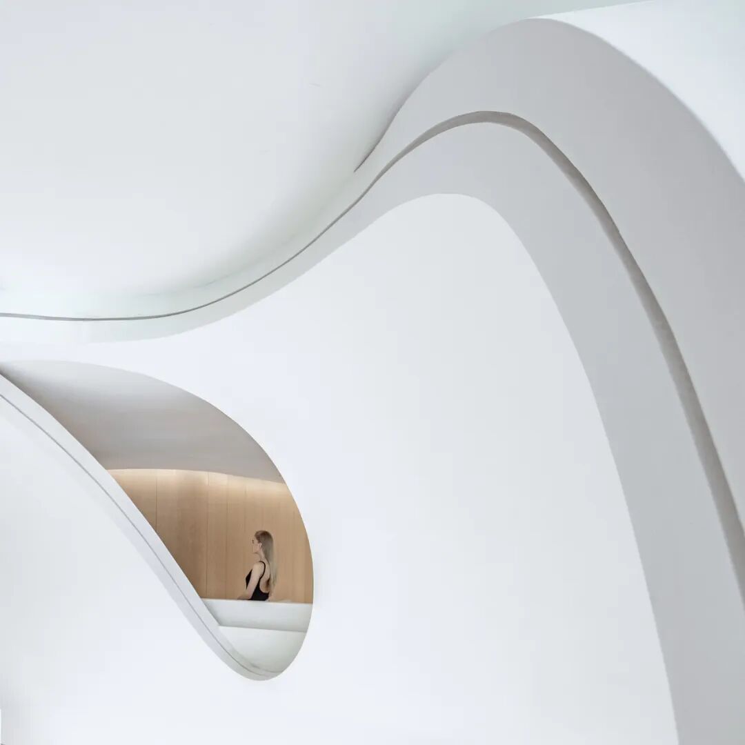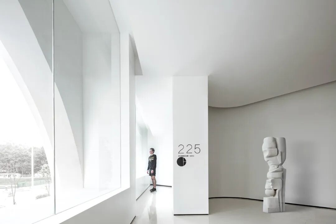 在入口处的8米高空间,我们打造了一种充满仪式感的体验,让人们进入艺术中心时仿佛踏入了一个神圣的教学空间。这个空间以其静谧的特质而著称,在光线的照耀下,它触动着每一个心灵。